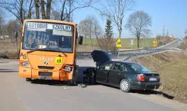 W poniedziałek (10.03.) około godz. 8.30 oficer dyżurny ełckiej komendy został poinformowany przez pracownika Centrum Powiadamiania Ratunkowego o wypadku drogowym, do którego doszło w jednej z miejscowości powiatu ełckiego. Ze wstępnych ustaleń policjantów wynika, że kierujący autobusem szkolnym na łuku drogi zjechał na przeciwległy pas ruchu i zderzył się z jadącym z naprzeciwka samochodem osobowym. Dwoje pasażerów audi – kobieta i mężczyzna zostali przewiezieni do szpitala. Autobusem jechało 14 dzieci ze szkoły podstawowej i gimnazjum z terenu powiatu ełckiego. Na miejsce wypadku podstawiony został drugi autobus, który przewiózł wszystkie dzieci do szkoły. Jak ustalili policjanci, po przyjeździe do szkoły dwie uczennice w wieku 14 i 15 lat zaczęły uskarżać się na bóle głowy. W związku z tym wezwano pogotowie ratunkowe i obie dziewczynki zostały przewiezione do szpitala. Policjanci wyjaśniają okoliczności zdarzenia. Kierowcy obu pojazdów byli trzeźwi.