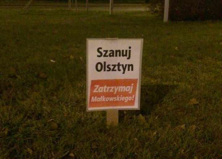 Tabliczki z napisem „Szanuj Olsztyn. Zatrzymaj Małkowskiego!” wyrosły z zaskoczenia w kilku miejscach między innymi przy ul. Dworcowej i Pana Tadeusza. Czytelnik, który podesłał nam zdjęcie twierdzi że tabliczki pojawiły się wczoraj, ale już dziś ślad po nich zaginął. Jak można się domyślać na tabliczce nie ma żadnych danych jego autora.