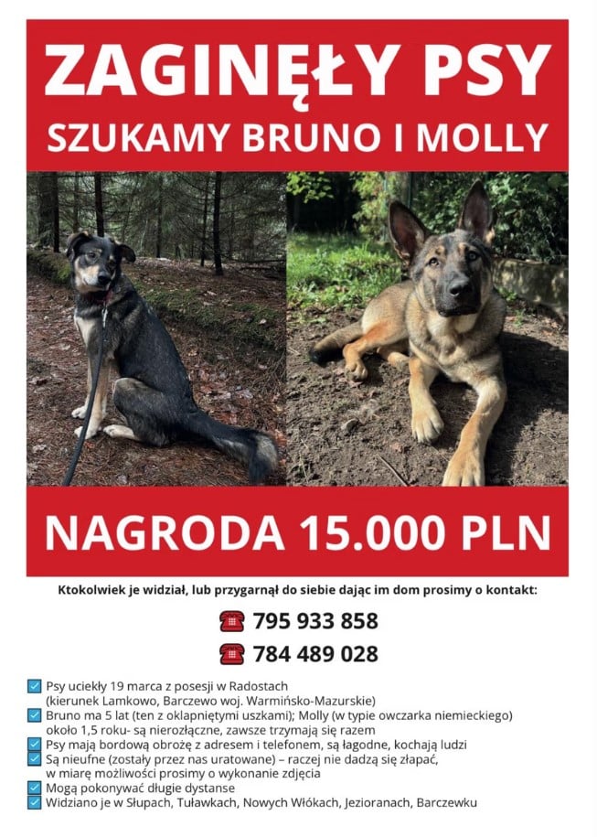 Pani Nikola rozpoczęła intensywne poszukiwania. W mediach społecznościowych pojawiły się zdjęcia psów, rozklejano plakaty i rozdawano ulotki. Kobieta poinformowała leśnictwa, schroniska i fundacje, a także wyznaczyła nagrodę w wysokości 15 tys. zł za informacje o zaginionych pupilach.