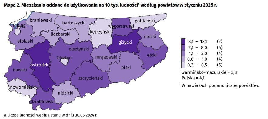 Urząd Statystyczny w Olsztynie informuje, że w styczniu 2025 roku zanotowano istotne zmiany w sektorze budownictwa mieszkaniowego w regionie. W porównaniu z analogicznym okresem roku ubiegłego, liczba mieszkań rozpoczętych wzrosła o 77,3%, a mieszkań oddanych do użytkowania o 41,3%. Jednocześnie odnotowano spadek o 42,1% w liczbie mieszkań, na których budowę uzyskano pozwolenia lub dokonano zgłoszeń z projektem budowlanym.