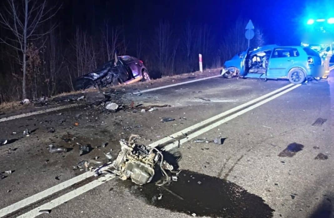 Do groźnego wypadku doszło w piątkowy wieczór w miejscowości Regiele na DK65. 21-letni kierowca VW Polo stracił panowanie nad pojazdem i uderzył czołowo w nadjeżdżające auto marki Kia.