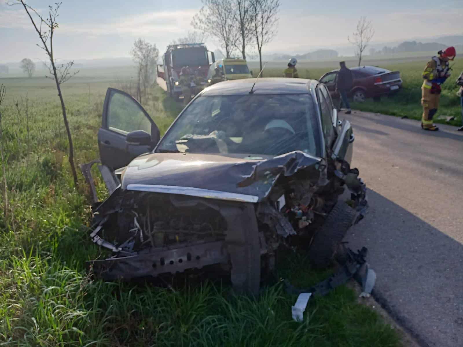 Zderzenie pojazdów było na tyle silne, że oba auta zostały poważnie uszkodzone. Z informacji służb wynika, że ranne zostały trzy osoby.