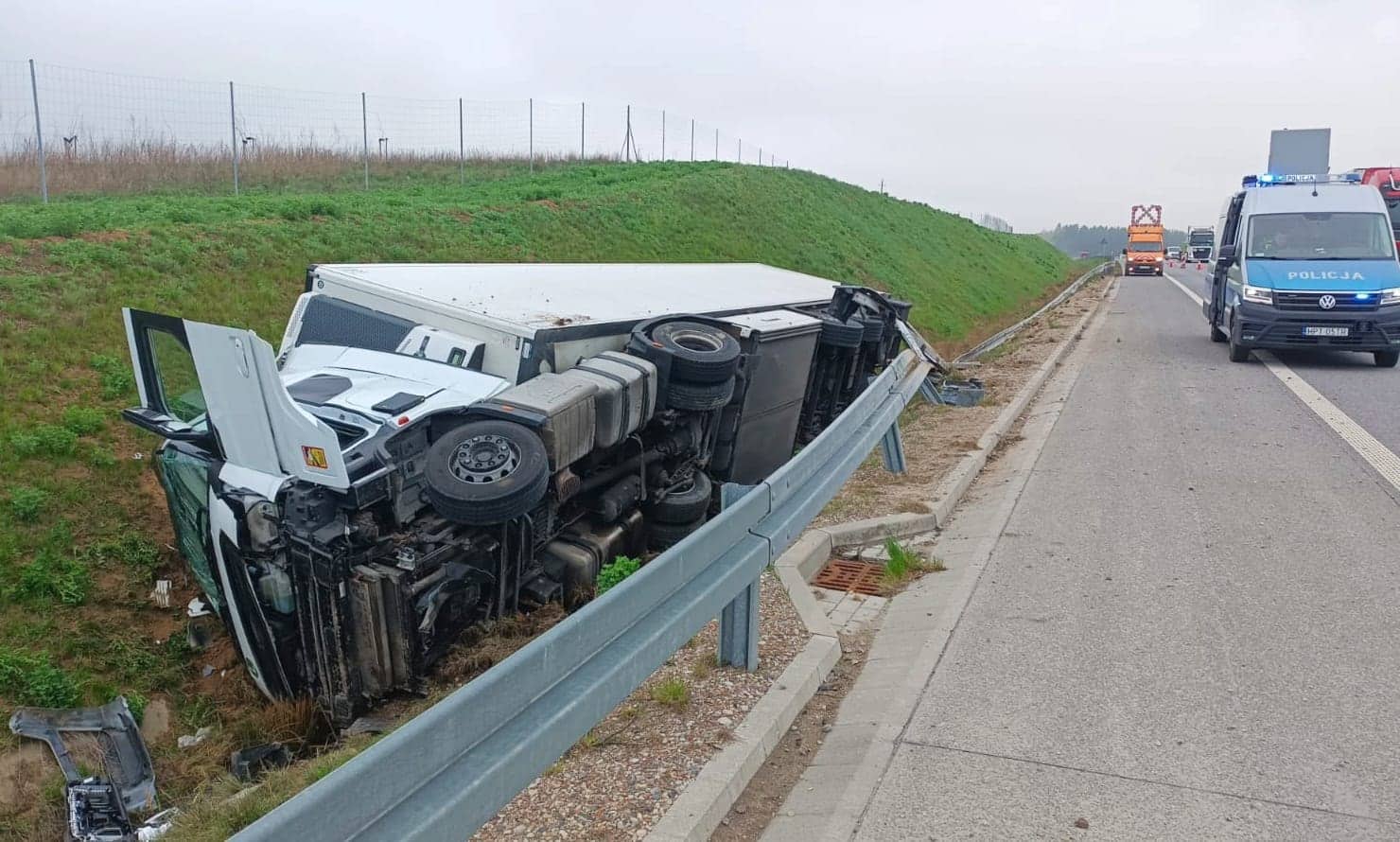 Dwie osoby trafiły do szpitala po przewróceniu się ciężarówki na trasie S61 w okolicach Cierni w gminie Ełk. Do zdarzenia doszło wczesnym rankiem 23 kwietnia.