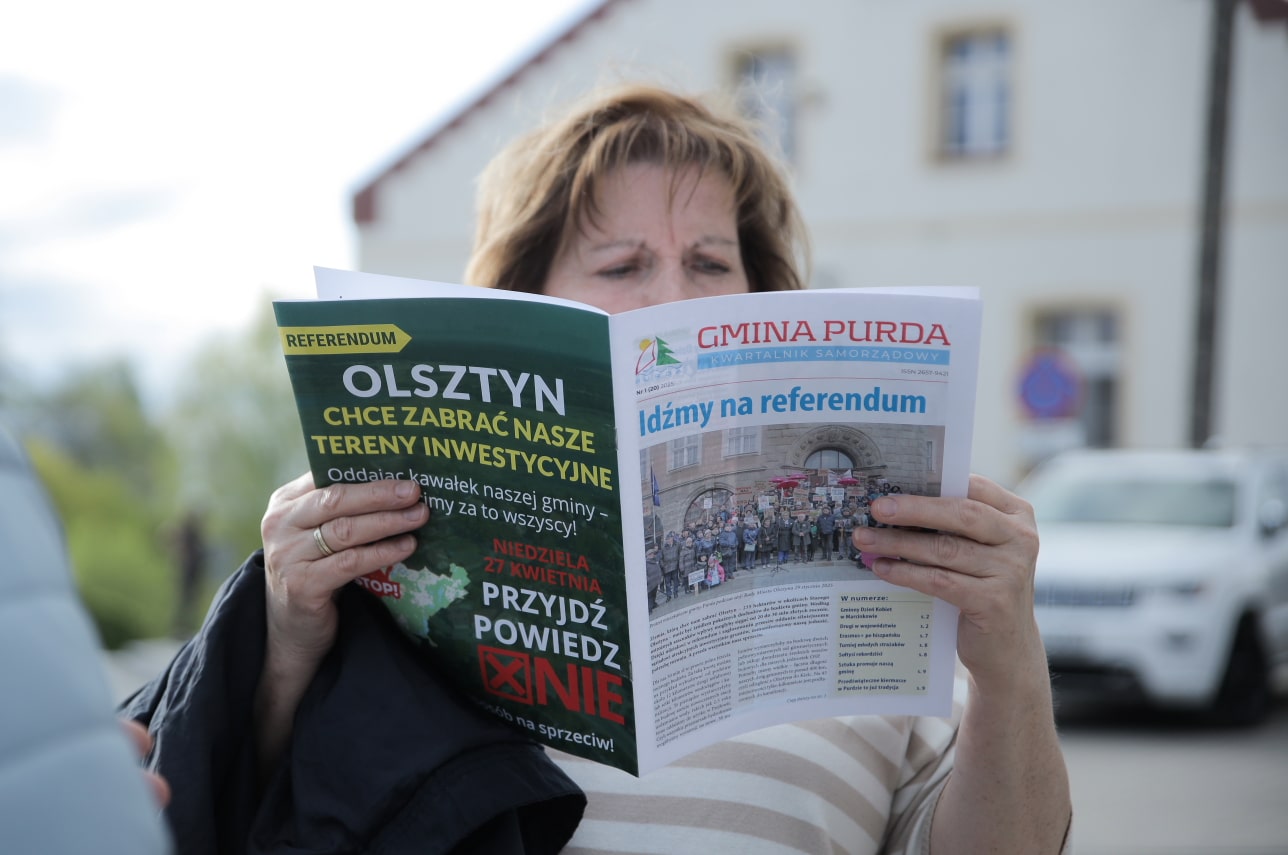 W reakcji na plany ratusza gmina Purda organizuje lokalne referendum. 27 kwietnia mieszkańcy odpowiedzą na pytanie: „Czy zgadzasz się na przejęcie przez Miasto Olsztyn gruntów leżących w gminie Purda?”. Głosowanie odbędzie się w dziewięciu lokalach, otwartych w godzinach 7:00–21:00. Aby było ważne, musi wziąć w nim udział co najmniej 30% uprawnionych mieszkańców.