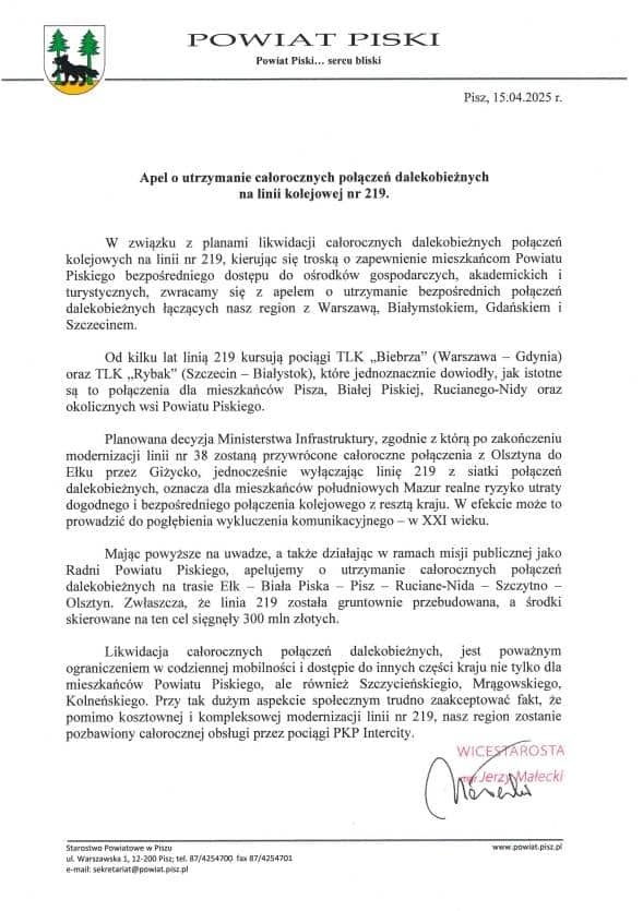 15 kwietnia 2025 r. Zarząd Powiatu Piskiego jednogłośnie przyjął stanowisko sprzeciwiające się planom likwidacji całorocznych połączeń dalekobieżnych na linii kolejowej nr 219. Obawy budzi możliwość ograniczenia kursów pociągów PKP Intercity kursujących trasą Ełk – Biała Piska – Pisz – Ruciane-Nida – Szczytno – Olsztyn.