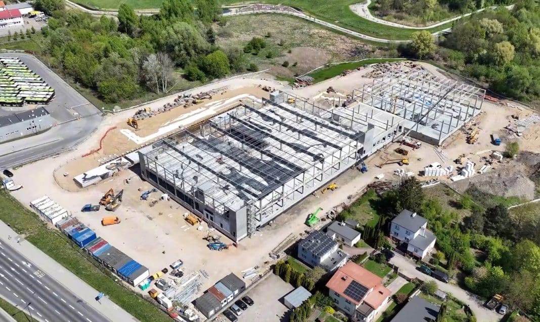 Budowa salonu meblowego przy al. Sikorskiego weszła w zaawansowaną fazę. Na nagraniu widać m.in. solidną stalową konstrukcję budynku, która obejmuje zarówno główną halę ekspozycyjną, jak i przestrzenie magazynowe.