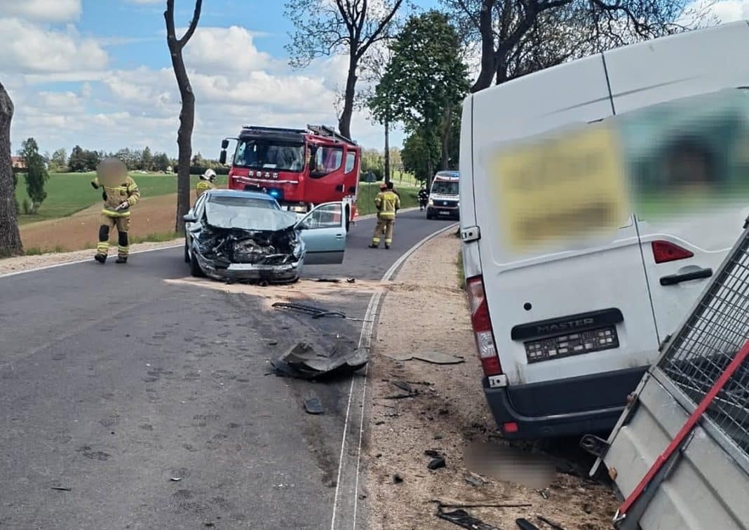 Do groźnego wypadku doszło w miejscowości Dobroszewo. Czołowo zderzyły się osobowa skoda i dostawczy renault. Poszkodowany kierowca trafił do szpitala śmigłowcem LPR.