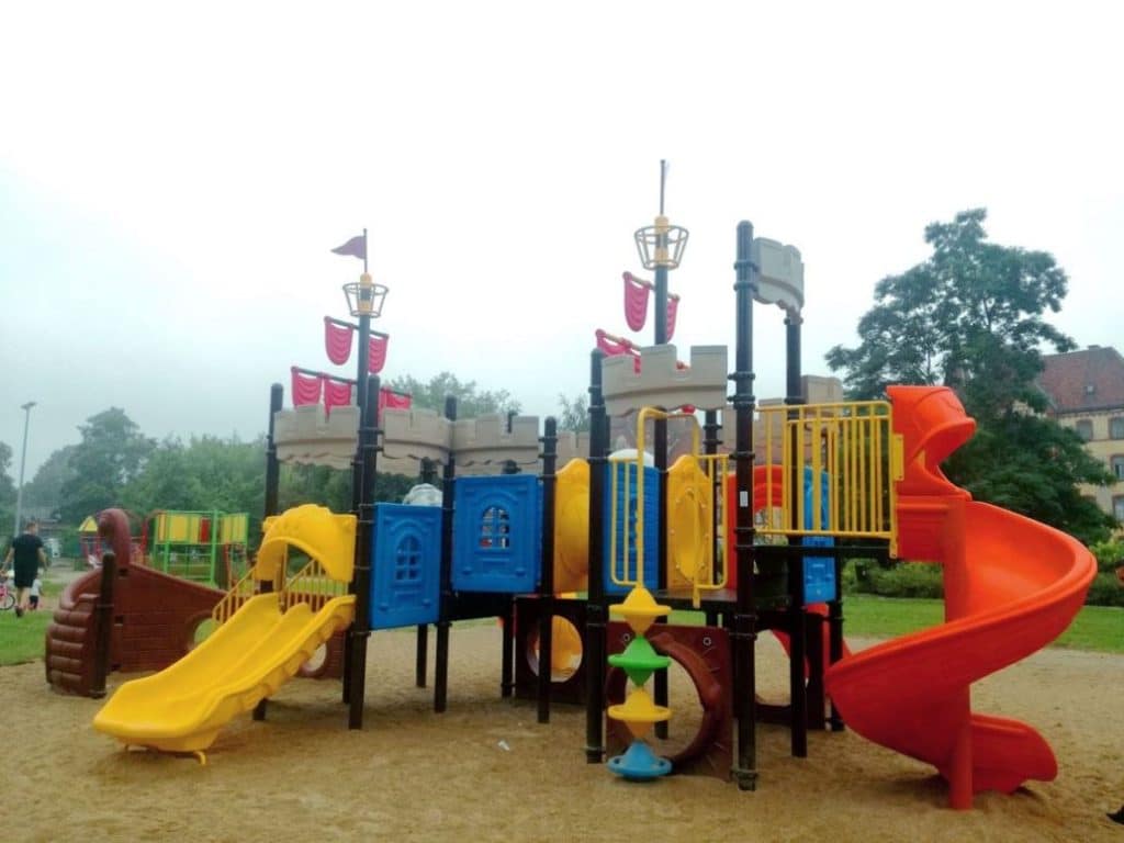 Plac zabaw w Parku Centralnym w Olsztynie to wyjątkowe miejsce, którego główną atrakcją jest ogromny statek piracki z krętymi zjeżdżalniami. Dzieci mogą wspinać się po linach, zjeżdżać po zjeżdżalniach i bawić się w kapitanów na pełnym morzu. Otoczony zielenią, plac jest w pełni ogrodzony, co zapewnia bezpieczeństwo najmłodszym użytkownikom.