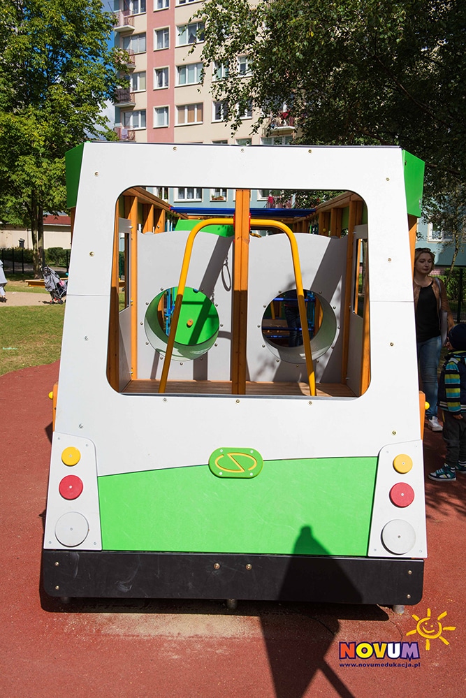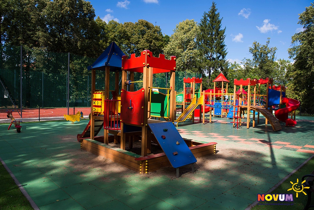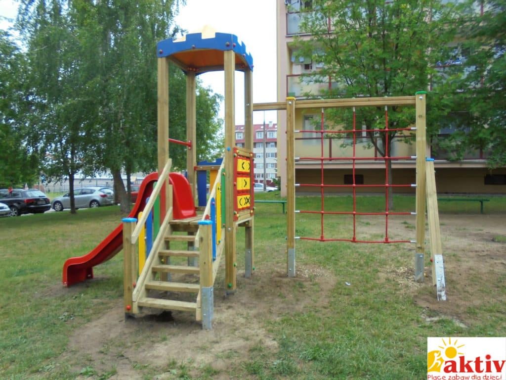 Centralnym punktem jest zestaw zabawowy z wieżyczką i zjeżdżalnią, uzupełniony o panel edukacyjny do gry w kółko i krzyżyk oraz kratownicę linową do wspinaczki. Dla najmłodszych przygotowano huśtawkę oraz bujak na sprężynie w kształcie konika. Cały plac jest położony na miękkim, trawiastym podłożu, co zwiększa bezpieczeństwo bawiących się dzieci.