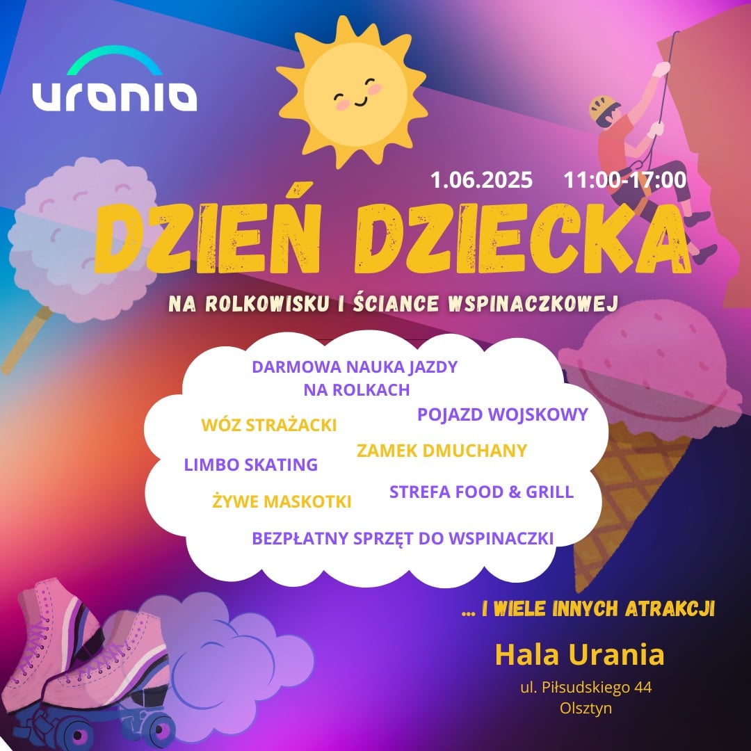 Oprócz wydarzeń na Starym Mieście, Olsztyn przygotował także coś wyjątkowego na Dzień Dziecka w Hali Urania. Już 1 czerwca 2025 roku, w godzinach od 11:00 do 17:00, Hala Urania zamieni się w kolorowy, tętniący radością plac zabaw. Na najmłodszych czekają dziesiątki atrakcji – od sportowych wyzwań po słodkie przysmaki.