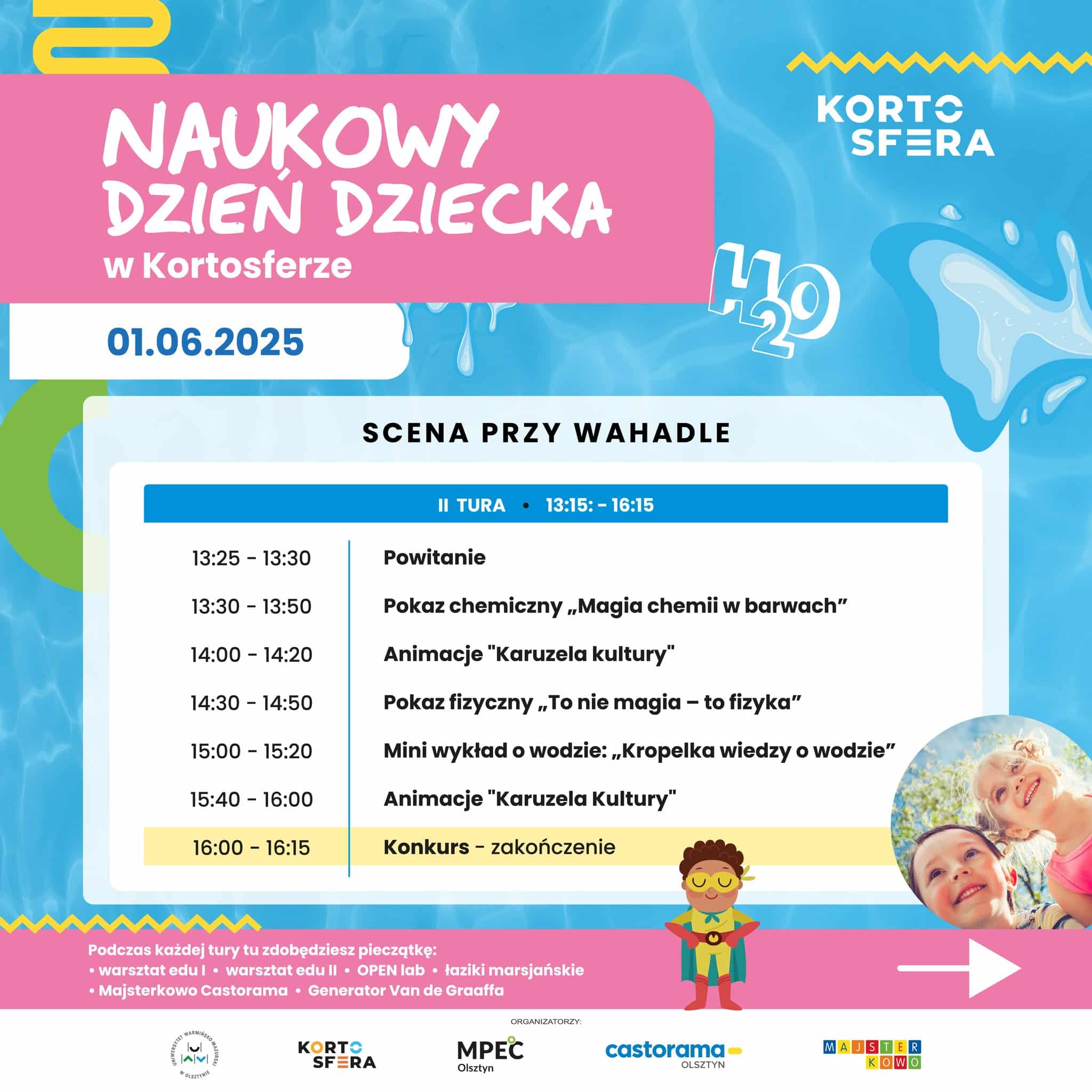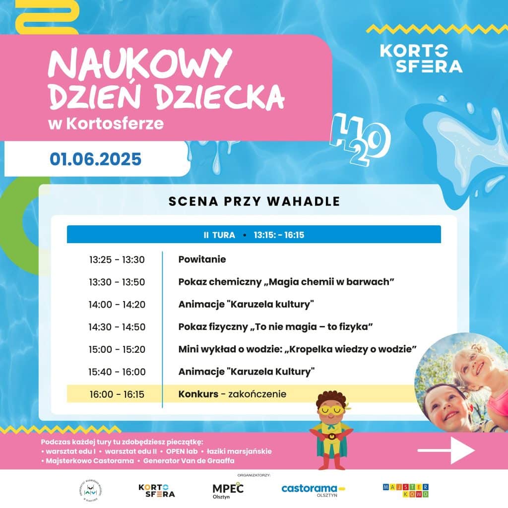 Poza sceną Kortosfera oferuje także strefy aktywności, które będą działać przez cały dzień. W programie znalazło się m.in. malowanie buziek, zabawy z animatorami i rodzinne konkursy z nagrodami. Dzieci spotkają uśmiechnięte postacie w kostiumach, a opiekunowie znajdą czas na chwilę relaksu, obserwując najmłodszych w akcji. Wstęp płatny, dzieci – 30 zł, dorośli – 20 zł.