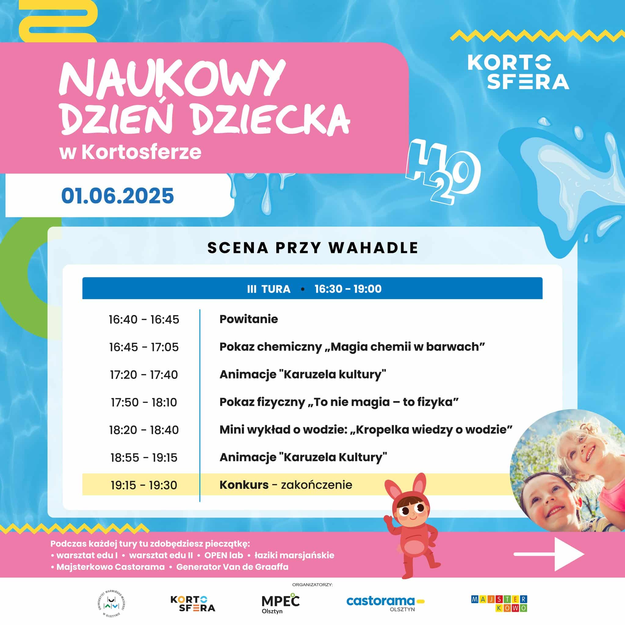 Na scenie przy wahadle dzieci obejrzą m.in. pokazy chemiczne: „Magia chemii w barwach” oraz fizyczne „To nie magia – to fizyka”, animacje „Karuzela kultury” i mini wykłady: „Kropelka wiedzy o wodzie”. Zwieńczeniem każdej tury będzie konkurs z nagrodami. Dodatkowo uczestnicy mogą zbierać pieczątki za udział w warsztatach: edukacyjnych, otwartych, marsjańskich i technicznych.
