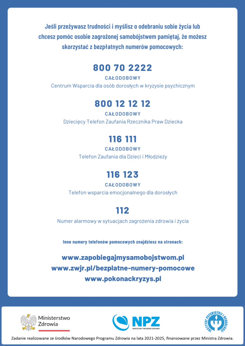 Ta sytuacja przypomina, że każdy z nas może mieć słabsze chwile, ale nigdy nie jest sam. Dla osób w kryzysie emocjonalnym działa całodobowa infolinia wsparcia, gdzie można uzyskać pomoc od psychiatrów, psychologów, pracowników socjalnych, a nawet prawników. Wystarczy sięgnąć po telefon, by otrzymać wsparcie.