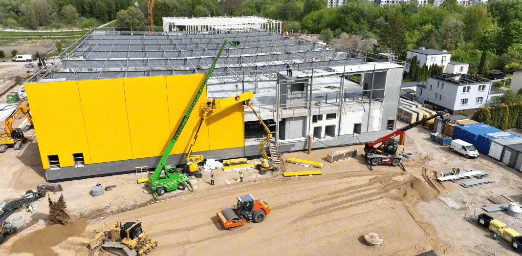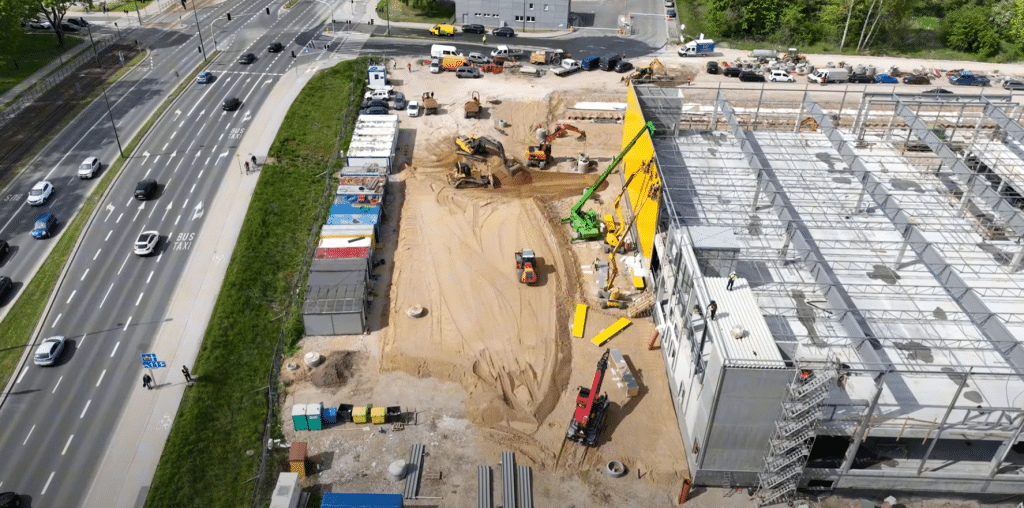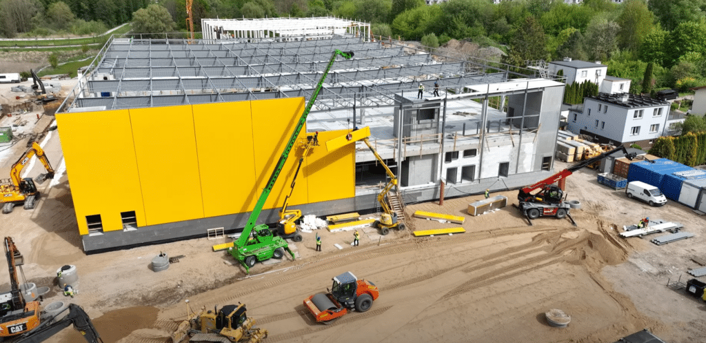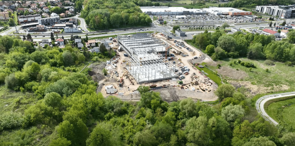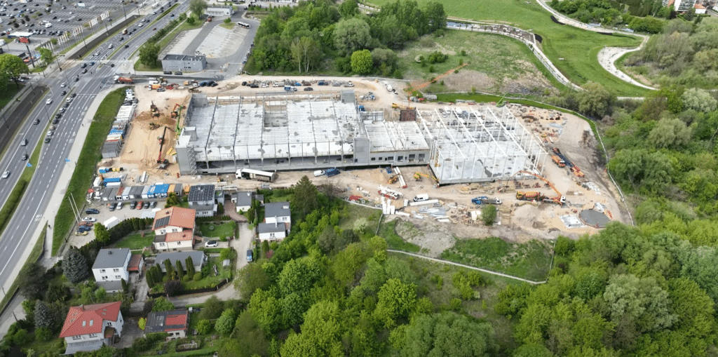 Budowa salonu meblowego Agata Meble przy al. Sikorskiego w Olsztynie weszła w zaawansowaną fazę. Na kanale Warmińskie Widoki na YouTube pojawiło się najnowsze nagranie z drona, które pokazuje zaawansowany etap budowy salonu Agata Meble w Olsztynie. Obecnie trwa montaż żółtych paneli na jednej z elewacji budynku. Widać także wyraźny zarys drugiej kondygnacji, gdzie zakończono montaż części elementów nośnych, a prace nad zadaszeniem są w toku. Na placu budowy działają liczne maszyny, a ekipy budowlane pracują równolegle w różnych strefach.
