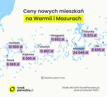 Z danych portalu BIG DATA RynekPierwotny.pl wynika, że w kwietniu 2025 roku średnia cena ofertowa nowego mieszkania w Olsztynie wynosiła 589 tys. zł. Oznacza to, że metr kwadratowy na rynku pierwotnym kosztował przeciętnie 11 457 zł. Mimo że Olsztyn jest stolicą województwa warmińsko-mazurskiego, wcale nie jest najdroższym miastem regionu.