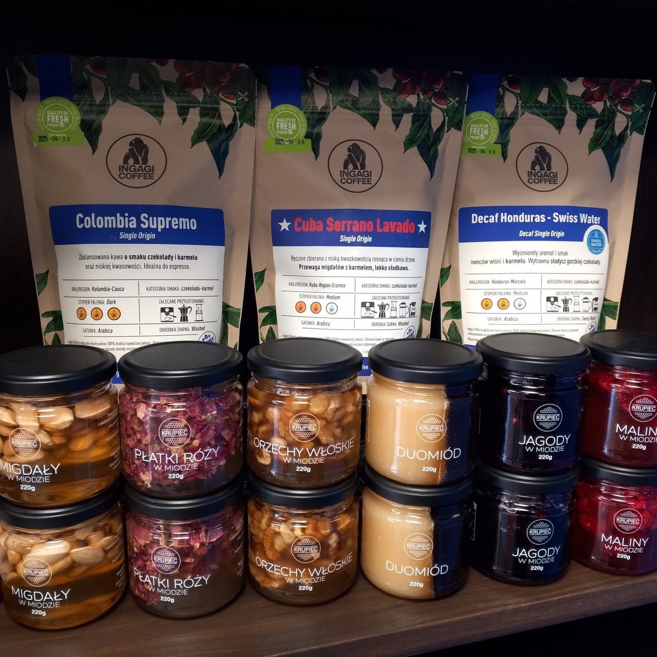 Craft oferuje szeroki wybór miodów, wśród których szczególne miejsce zajmują produkty z polskich pasiek. Na półkach znaleźć można m.in. miody z dodatkami – jagodami, malinami, płatkami róży, orzechami włoskimi czy migdałami, a także gładko kremowany duomiód. To naturalne produkty o wysokiej jakości, dostępne w estetycznych słoiczkach, które świetnie sprawdzają się zarówno do codziennego użytku, jak i jako prezent.