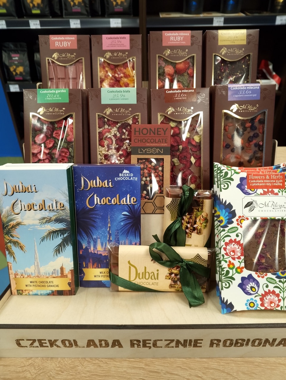 W ofercie nie brakuje również czekolad rzemieślniczych, które wyróżniają się nie tylko smakiem, ale i estetyką wykonania. Wśród dostępnych marek znajduje się m.in. Beskid Chocolate, oferująca ręcznie robione tabliczki z dodatkiem malin, wiśni, pistacji, ananasa czy płatków róży. W ofercie są zarówno czekolady mleczne, gorzkie, jak i białe – każda z charakterystycznym akcentem smakowym, często inspirowanym naturą lub regionalnym dziedzictwem.
