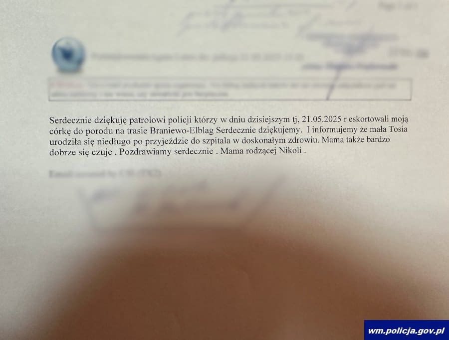 „Serdecznie dziękuję patrolowi policji którzy w dniu dzisiejszym tj. 21.05.2025 r eskortowali moją córkę do porodu na trasie Braniewo-Elbląg. Serdecznie dziękujemy. I informujemy że mała Tosia urodziła się niedługo po przyjeździe do szpitala w doskonałym zdrowiu. Mama także bardzo dobrze się czuje. Pozdrawiamy serdecznie. Mama rodzącej Nikoli”.