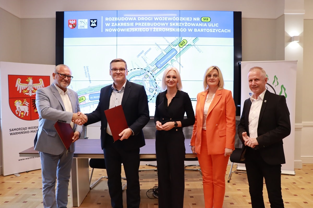 Pierwsza z inwestycji dotyczy przebudowy newralgicznego skrzyżowania ulic Nowowiejskiego i Żeromskiego w Bartoszycach – na drodze wojewódzkiej nr 512. W ramach prac powstanie tzw. małe rondo, zatoki autobusowe, nowe chodniki i ścieżki rowerowe, a także kanalizacja deszczowa odprowadzająca wody do rzeki Łyny.
