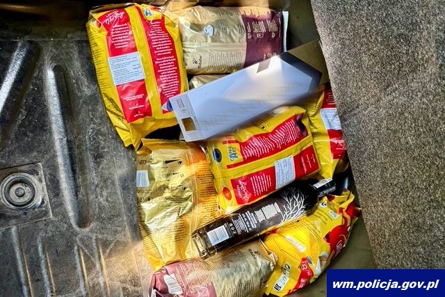 W pojeździe znaleziono skradzione artykuły spożywcze i alkoholowe o wartości około 120 zł. Jak ustalono, pochodziły one z kradzieży w sklepie w Kajkowie, do której doszło wcześniej tego samego dnia.