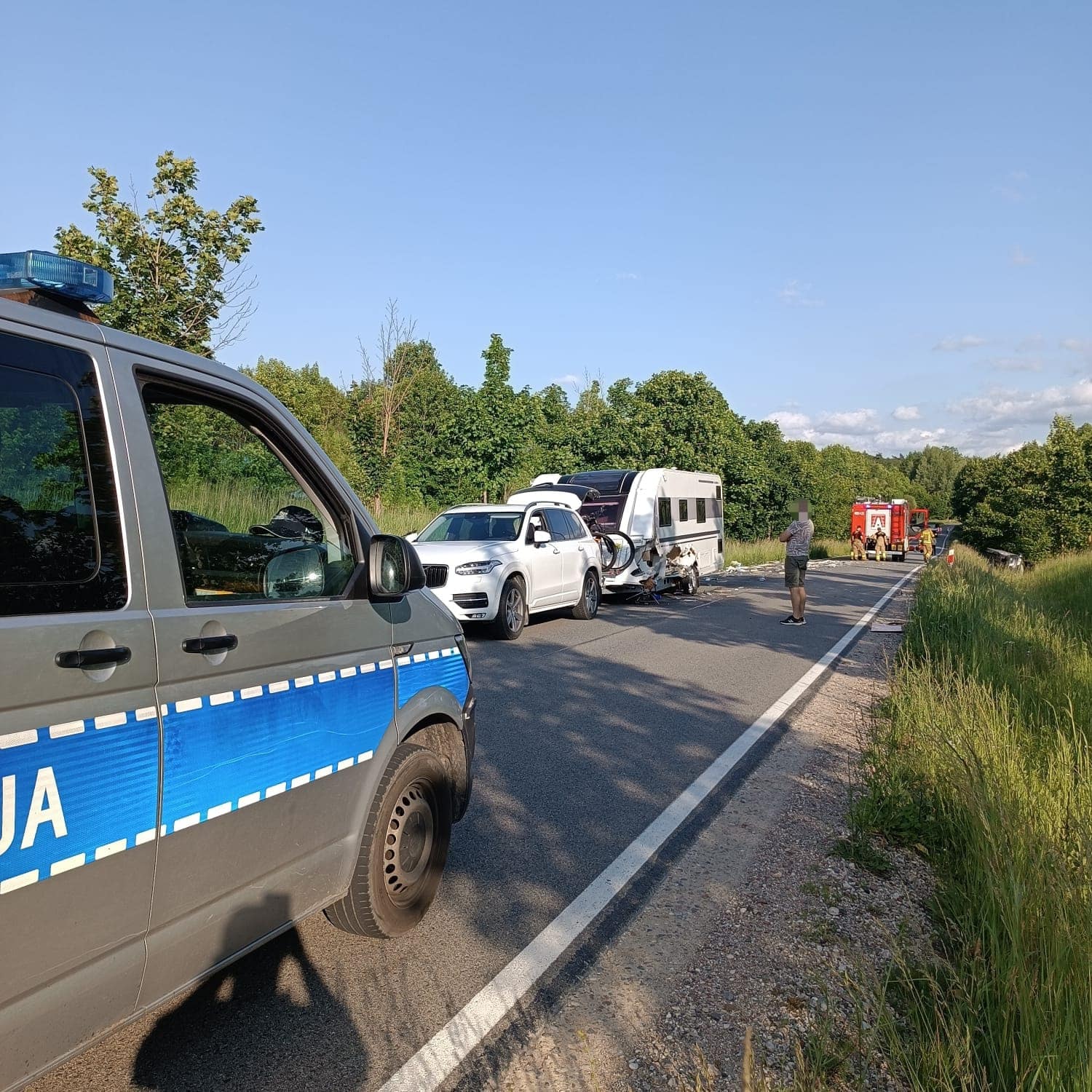 Groźna kolizja drogowa miała miejsce 17 czerwca po południu na DK 16 w pobliżu Mrągowa. Suzuki zderzyło się z volvo ciągnącym przyczepę kempingową.