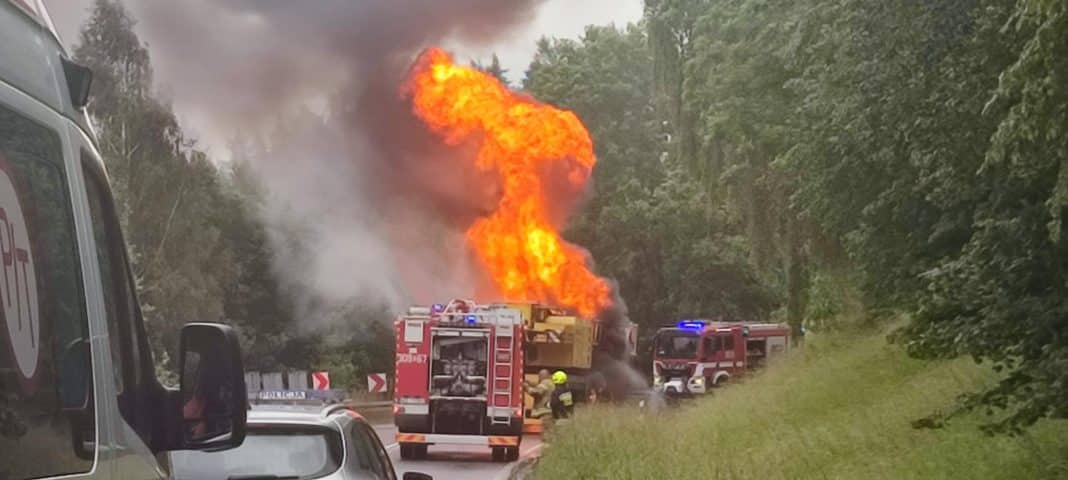Na odcinku drogi krajowej nr 51 między Spręcowem a Ługwałdem doszło do pożaru dużego samochodu dźwigu. Trasa została całkowicie zablokowana, a działania gaśnicze prowadzi kilka jednostek straży pożarnej.