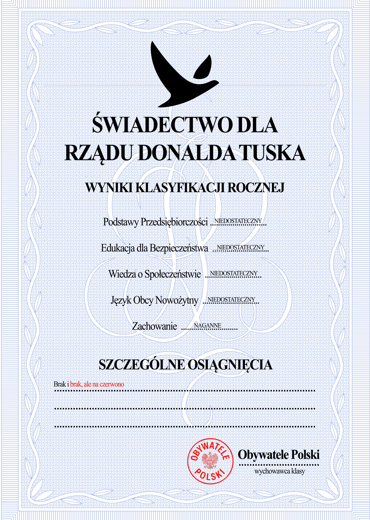 Z zachowania – ocena naganna, za język i postawę polityków koalicji wobec obywateli spoza wielkich miast.