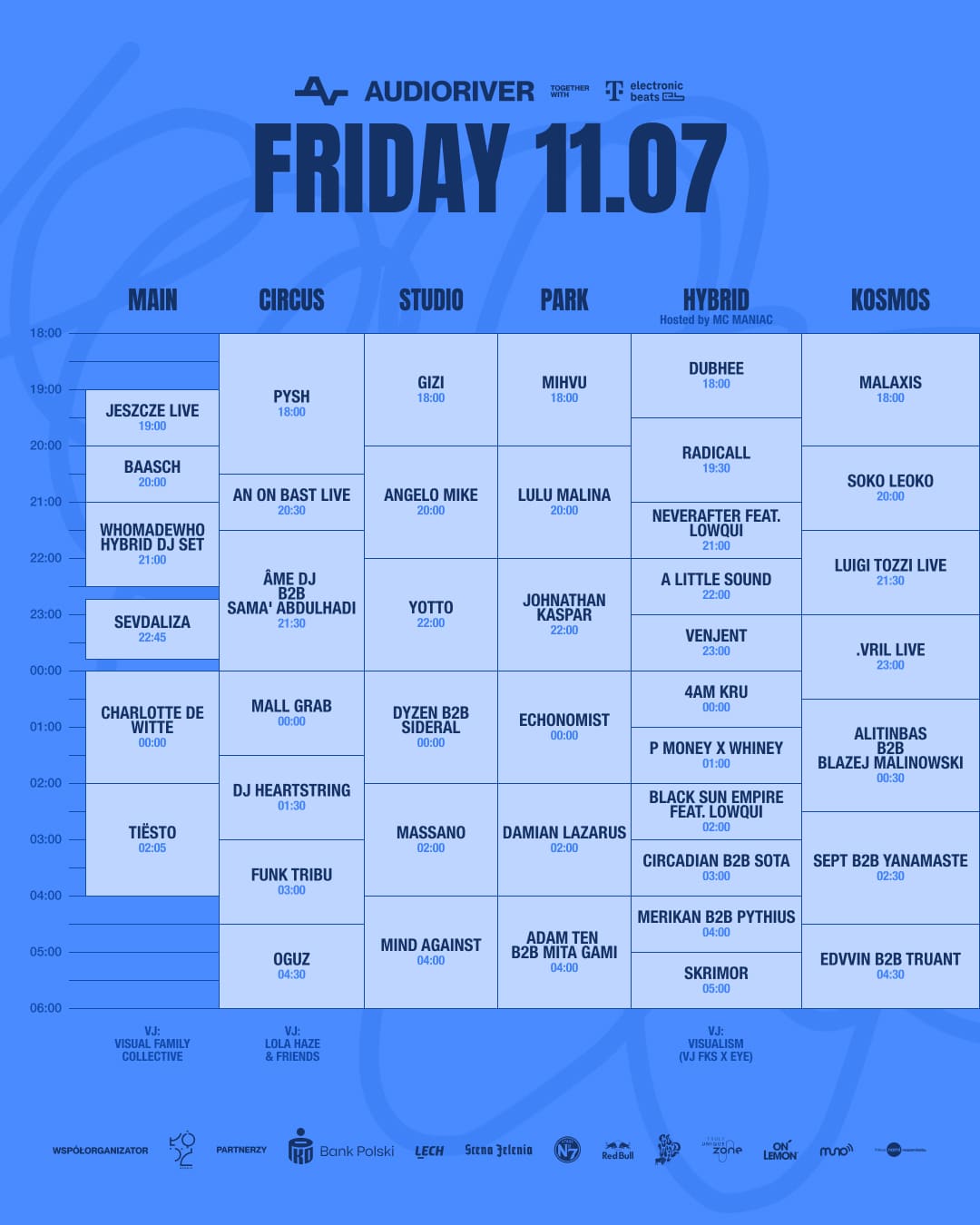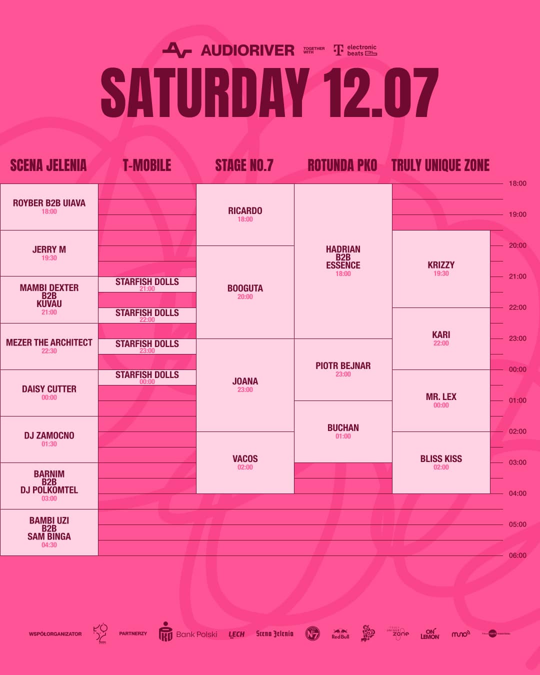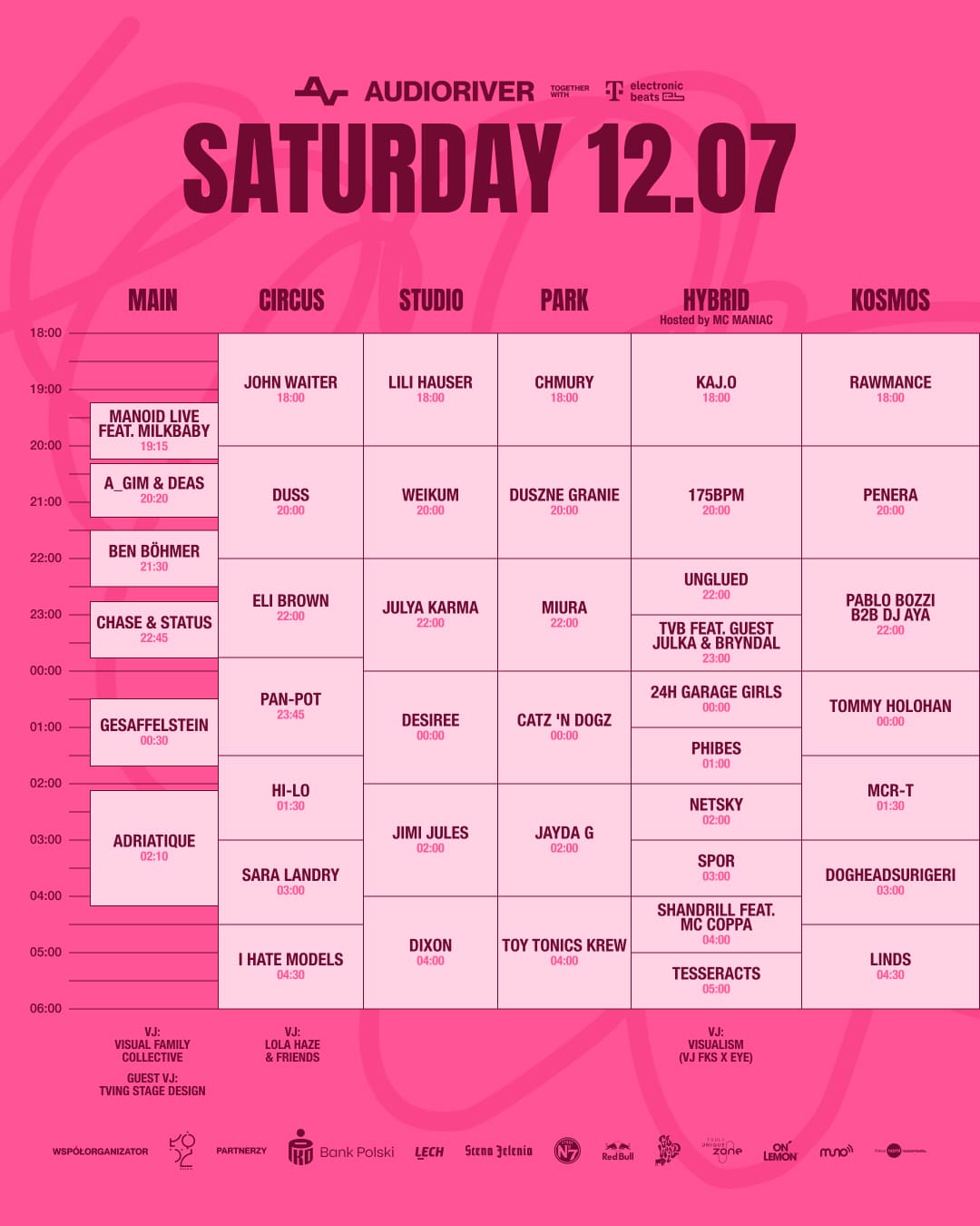 Wśród gwiazd Audioriver Together With T-Mobile Electronic Beats znajdują się między innymi legendarny Tiësto, wygrywająca plebiscyt DJ Maga na najlepszą techno DJ-kę już cztery lata z rzędu Charlotte de Witte, przebojowy duet drum & bassowy Chase & Status czy Sevdaliza, diva, której przebój „Alibi” rządzi mediami społecznościowymi.