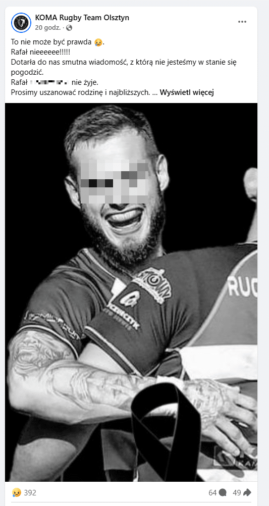 Śmierć Rafała wstrząsnęła olsztyńskim środowiskiem sportowym. KOMA Rugby Team Olsztyn, w którym grał, poinformował o tragedii w mediach społecznościowych, prosząc o uszanowanie rodziny i bliskich.