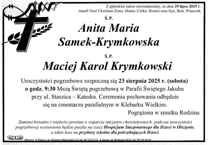 Rodzina poinformowała, że uroczystości pogrzebowe rozpoczną się 23 sierpnia 2025 roku (sobota) o godz. 9:30 Mszą Świętą w Parafii Świętego Jakuba (katedra przy ul. Staszica w Olsztynie). Po nabożeństwie trumny z ciałami zostaną złożone na cmentarzu parafialnym w Klebarku Wielkim.