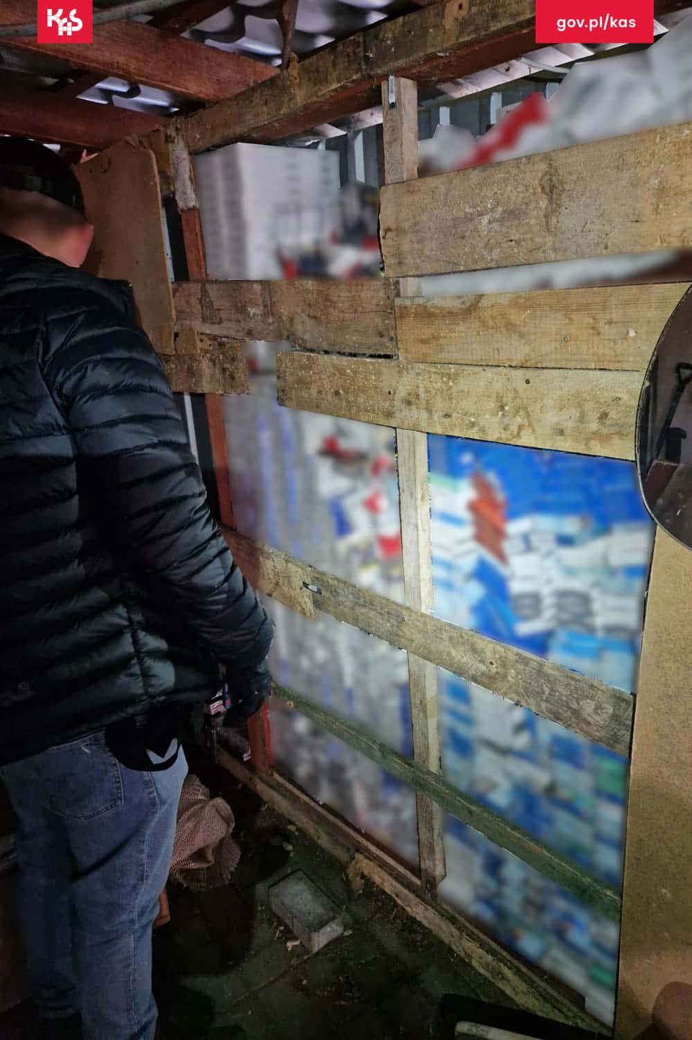 Jeszcze bardziej zaskakującego odkrycia dokonano na drugiej posesji. W garażu funkcjonariusze zauważyli nietypową obudowę jednej ze ścian. Po odchyleniu płyty okazało się, że cała przestrzeń za nią była wypełniona paczkami papierosów. W tym miejscu zabezpieczono aż 145,8 tysiąca sztuk papierosów bez akcyzy.