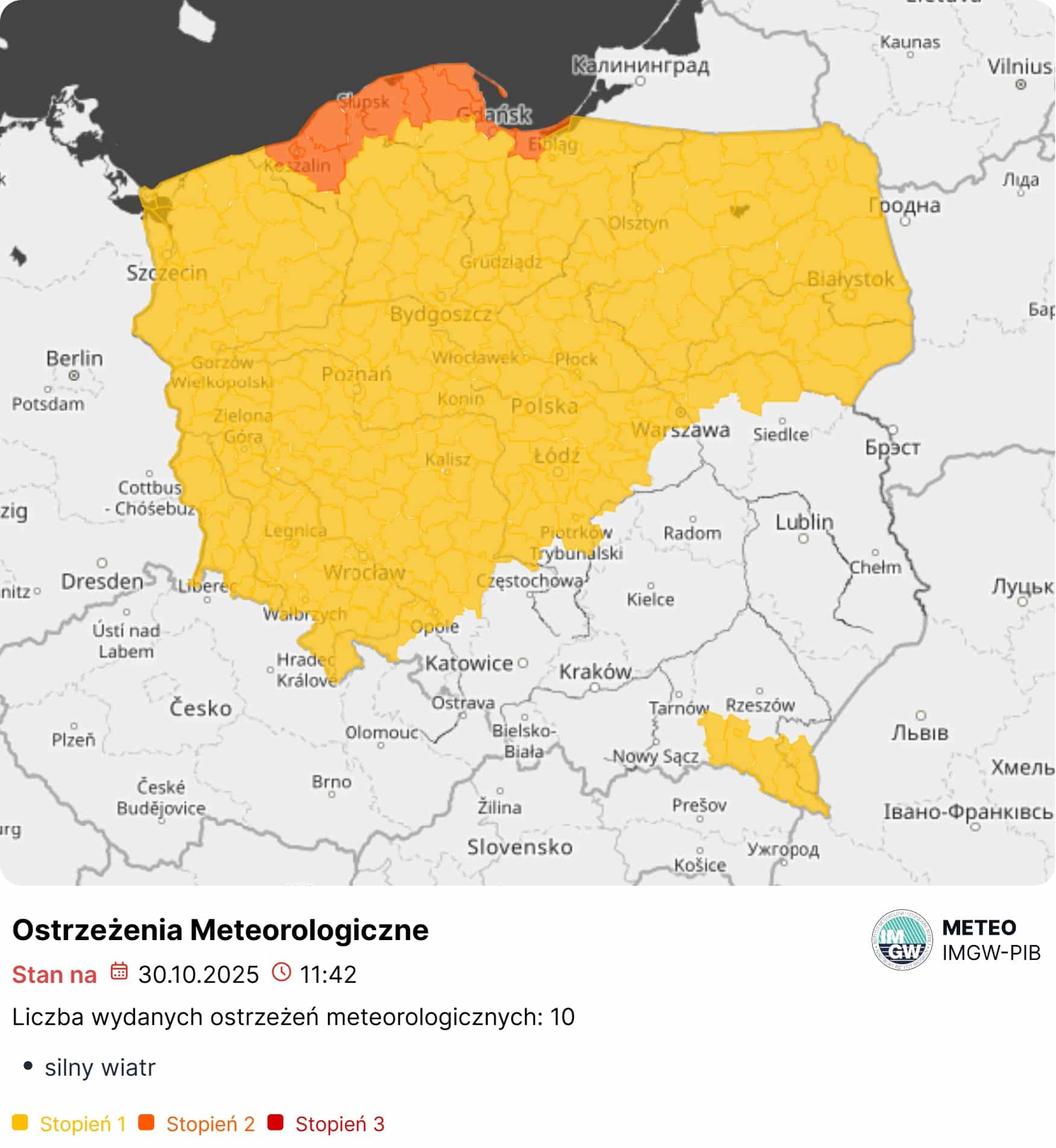 Instytut Meteorologii i Gospodarki Wodnej – Państwowy Instytut Badawczy (IMGW-PIB) wydał w czwartek, 30 października 2025 roku, ostrzeżenie meteorologiczne pierwszego stopnia dla województwa warmińsko-mazurskiego. Synoptycy prognozują wystąpienie silnego wiatru o średniej prędkości do 40 km/h, w porywach nawet do 75–80 km/h. Wiatr będzie wiał z kierunku południowo-zachodniego i zachodniego.
