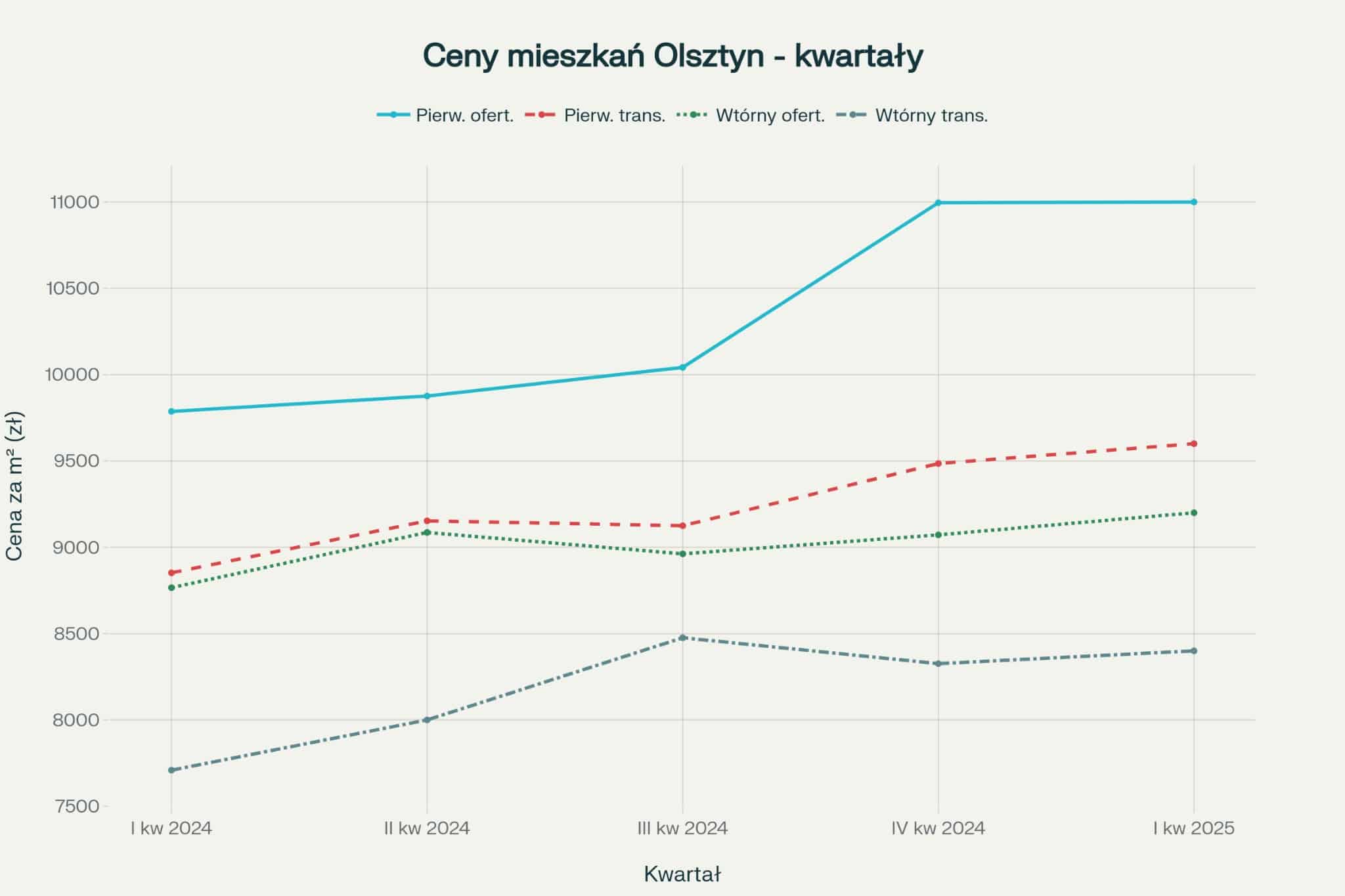 Rynek nieruchomości w stolicy Warmii i Mazur doświadczył stabilnego wzrostu cen w ostatnim okresie. Analiza danych z 2024 i początku 2025 roku pokazuje, że średnia cena mieszkania za metr kwadratowy wzrosła z 9 077 zł/m² w I kwartale 2024 r. do 9 636 zł/m² w II kwartale 2025 r., co oznacza wzrost o 6,2% w ciągu pięciu kwartałów. Szczególnie wyraźny skok cenowy nastąpił na początku 2025 r., kiedy to średnie ceny przekroczyły próg 9 400 zł za metr kwadratowy.