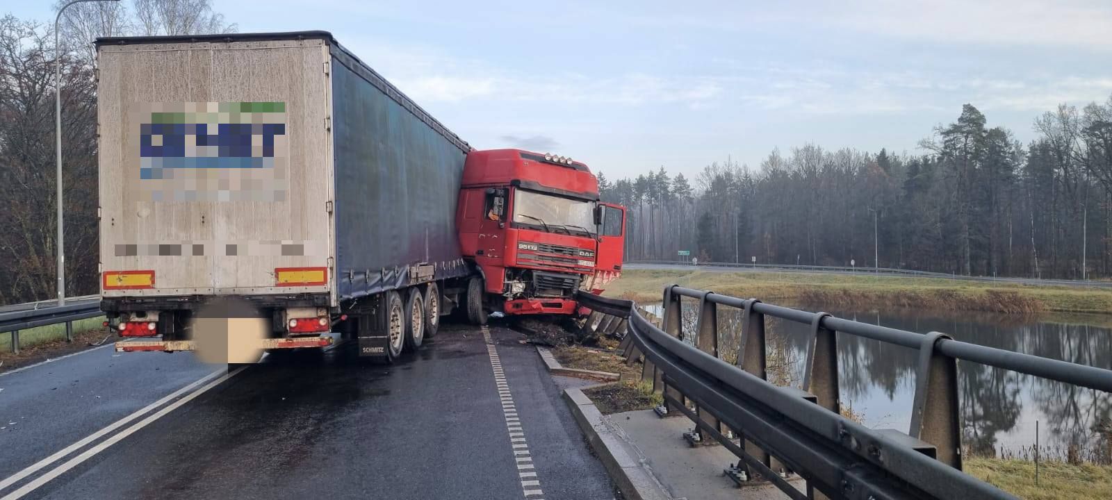 Do zdarzenia doszło 17 listopada na drodze krajowej K-54, w rejonie węzła Braniewo Południe. Samochód ciężarowy z naczepą zjechał z toru jazdy i uderzył przodem w barierę energochłonną znajdującą się przy moście nad zbiornikiem wodnym. Kabina pojazdu – czerwony ciągnik siodłowy marki DAF – została wyraźnie uszkodzona, a bariera drogowa jest znacząco wygięta.