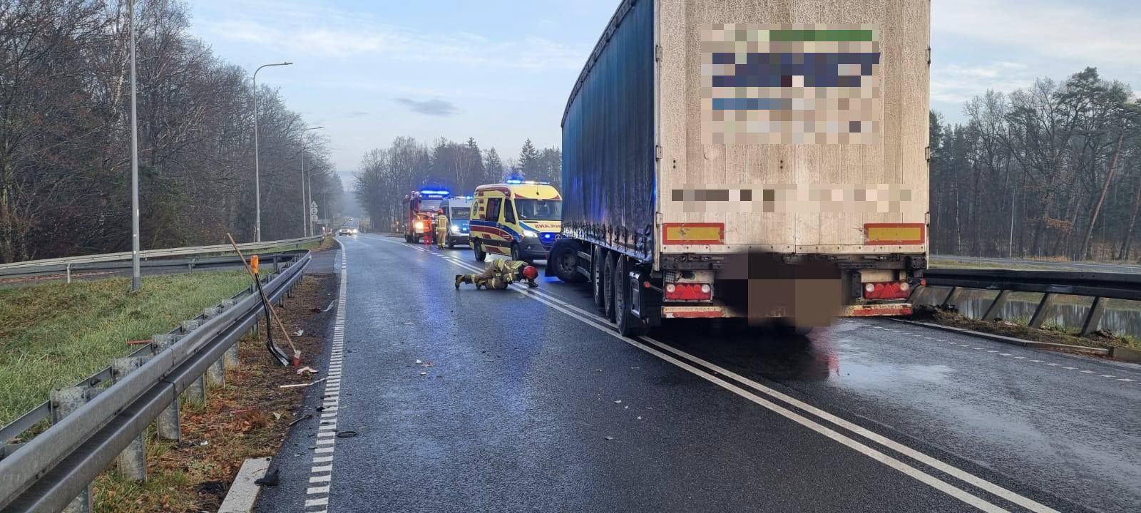 Ciężarówka stanęła częściowo w poprzek jezdni, co doprowadziło do zablokowania jednego pasa ruchu.