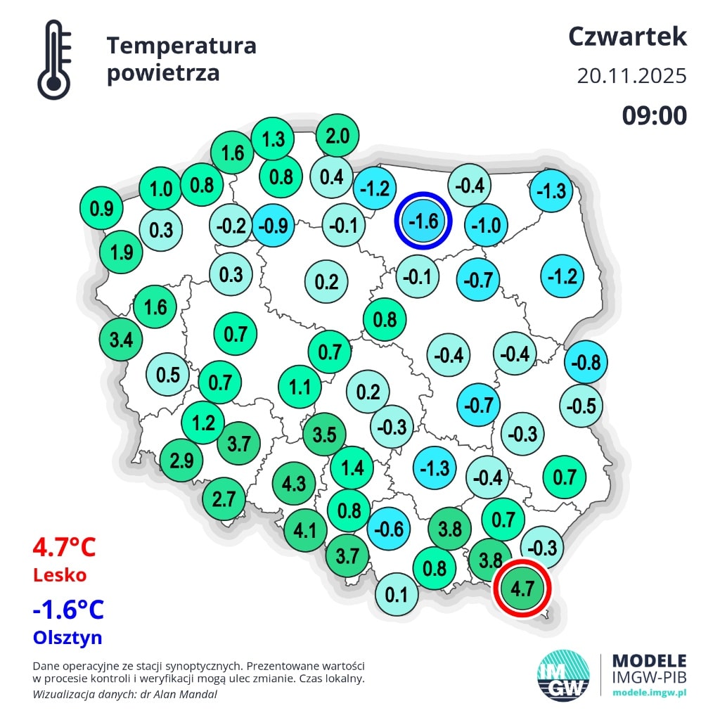 Mapa temperatur z godziny 9:00 rano 20 listopada ukazała wyraźny podział klimatyczny Polski. Podczas gdy obszary południowo-zachodnie i podkarpackie cieszyły się dodatnimi temperaturami, często przekraczającymi 3 stopnie (np. 4.1 i 4.3 w rejonie południowym), północny wschód, w tym Suwałki, Białystok oraz centralna część wybrzeża, witały dzień z temperaturami ujemnymi lub bliskimi zeru.