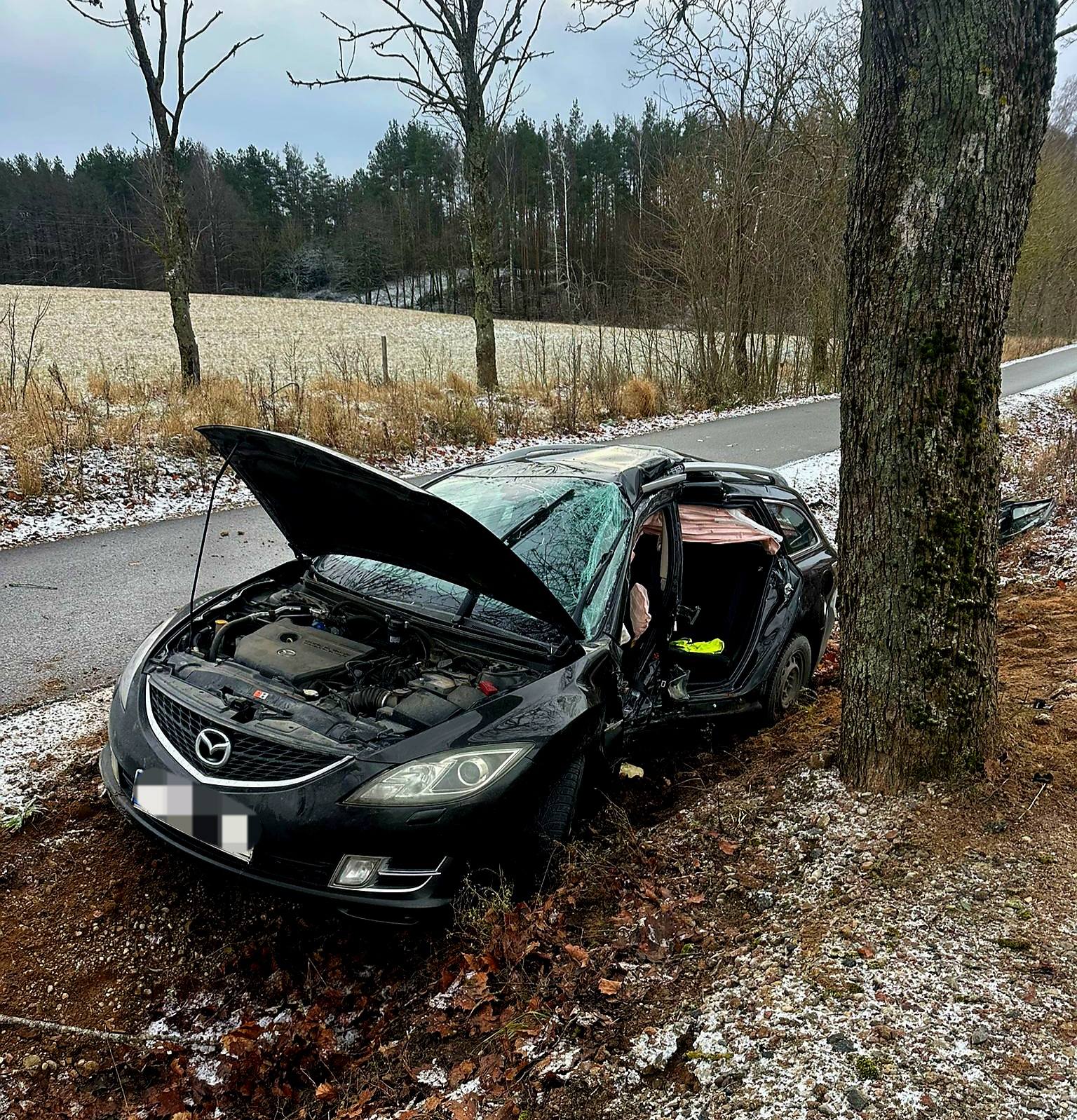 Jak ustalili policjanci, 32-letnia kierująca czarną mazdą nie dostosowała prędkości do zimowych, trudnych warunków panujących na drodze. Auto wpadło w poślizg, zjechało na pobocze i z dużą siłą uderzyło w przydrożne drzewo. Siła zderzenia była tak duża, że pojazd został poważnie zniszczony.