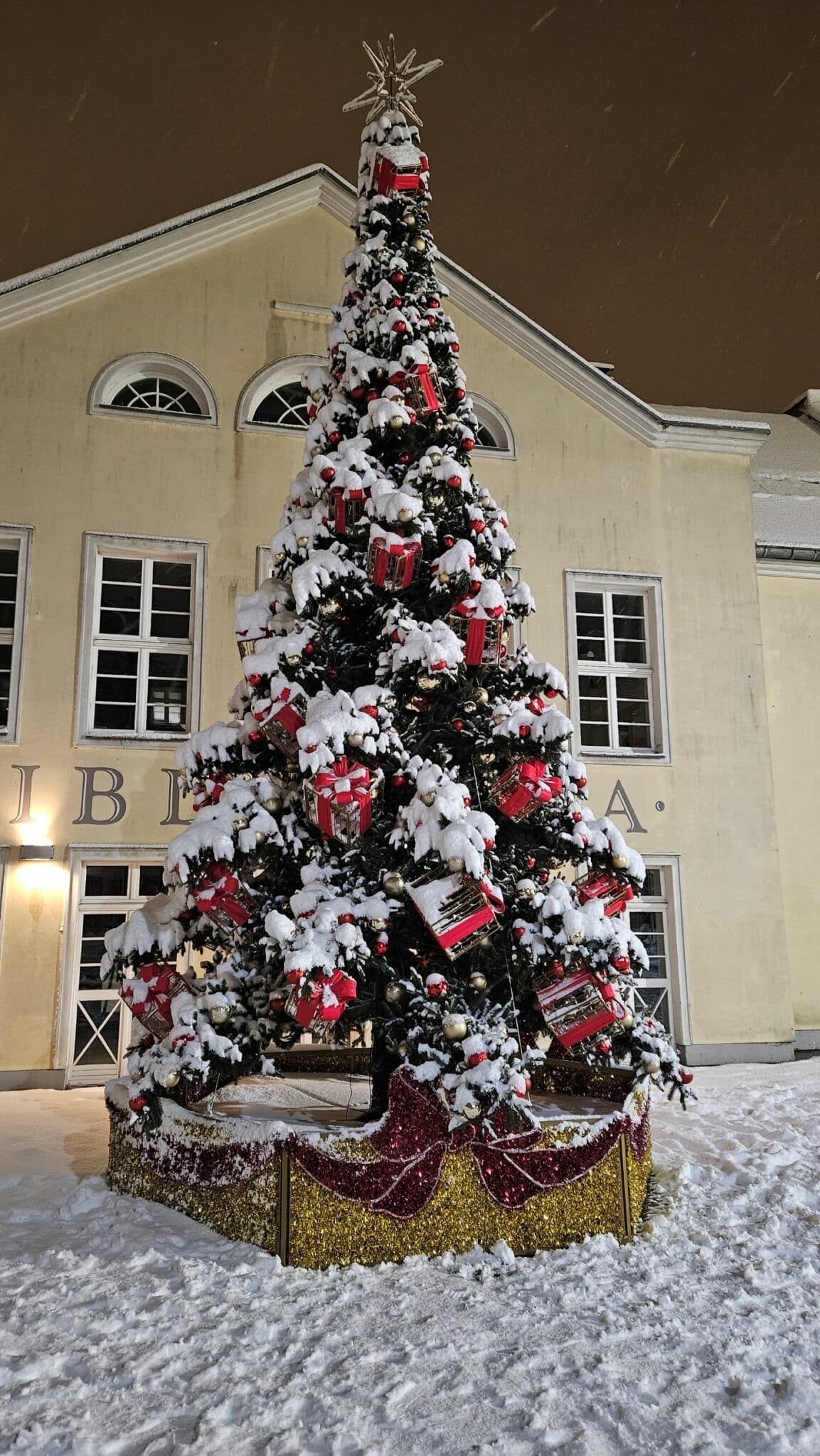 Drzewko ustawione na Starym Mieście od lat jest jednym z najbardziej charakterystycznych elementów olsztyńskich przygotowań do świąt. W tym roku pojawiło się w tradycyjnym miejscu, tuż przy bibliotece. Tegoroczna choinka została udekorowana bombkami w odcieniach złota i czerwieni, dużymi ozdobnymi kokardami i zawieszkami w kształcie prezentów. Ma ponad 10 metrów wysokości i około 5,5 metra średnicy. A na sobie około 20 tysięcy lampek.
