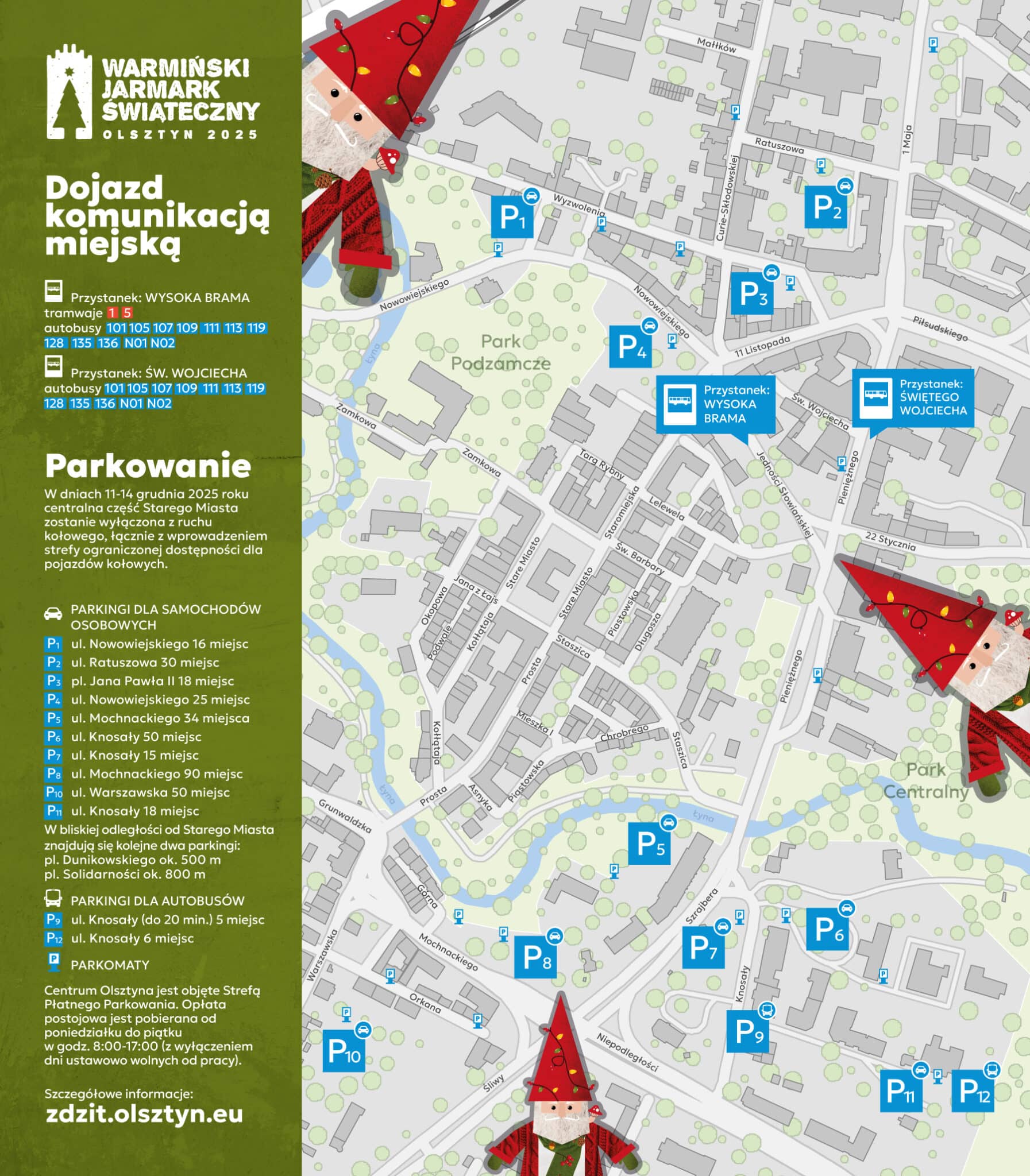 Olsztyński ratusz zachęca, by na jarmark wybrać się komunikacją miejską. Jak podaje Urząd Miasta Olsztyna, tramwaje i autobusy zatrzymują się dosłownie kilka kroków od wejść na starówkę, co pozwala pominąć największe utrudnienia. Tramwaje linii 1 i 5 oraz autobusy 101, 105, 107, 109, 111, 119, 128, 135, 136, a także nocne N01 i N02 dowożą pasażerów bezpośrednio w rejon Wysokiej Bramy i Świętego Wojciecha.