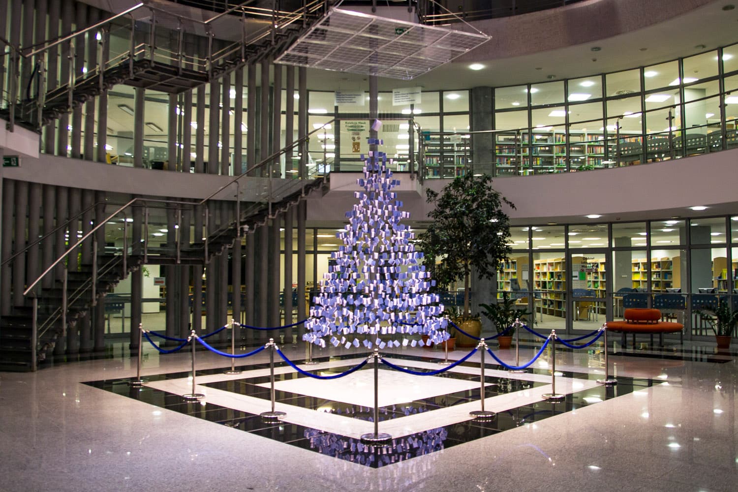 W 2022 roku bibliotekarze wykonali drzewko w pełni z elementów oświetleniowych. Setki metrów przewodów, dziesiątki punktów LED i spiralna konstrukcja stworzyły instalację przypominającą świetlisty lej. Forma była nowoczesna, dynamiczna i przyciągała uwagę w ciemniejszych przestrzeniach biblioteki.