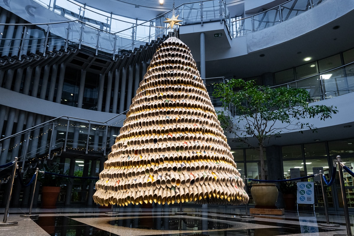 To jedna z najbardziej spektakularnych instalacji w historii. Choinka z 2023 roku miała: prawie 4 metry wysokości, 19 okręgów konstrukcyjnych, 2200 rulonów gazet malowanych złotą farbą, strukturę zawieszoną pod kopułą biblioteki. Projekt stworzyła Elżbieta Stawska, a nad wykonaniem pracował zespół 10 osób. Motyw przewodni: zero waste, przemijanie papierowych mediów i symboliczny powrót do źródeł — bo biblioteka zaczęła od książek i gazet.