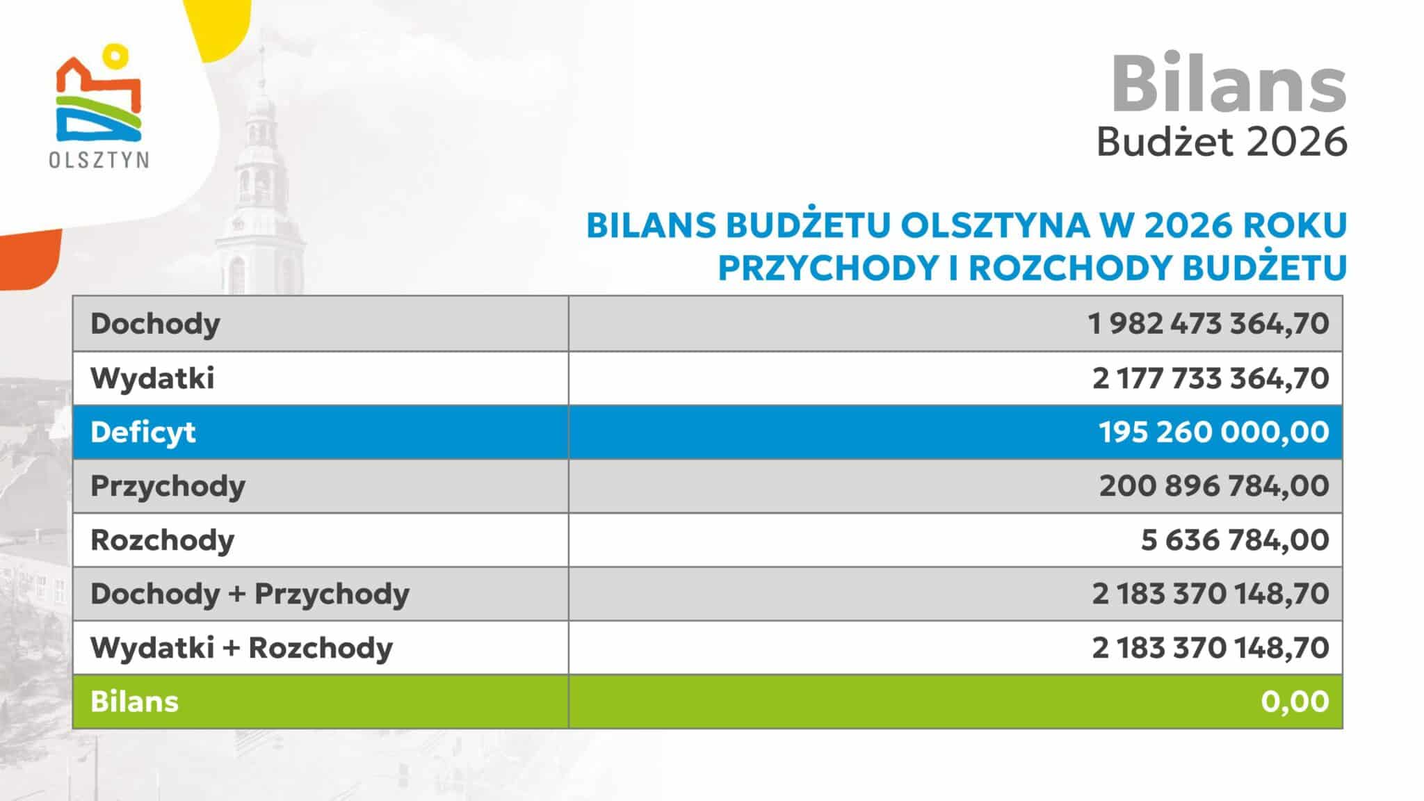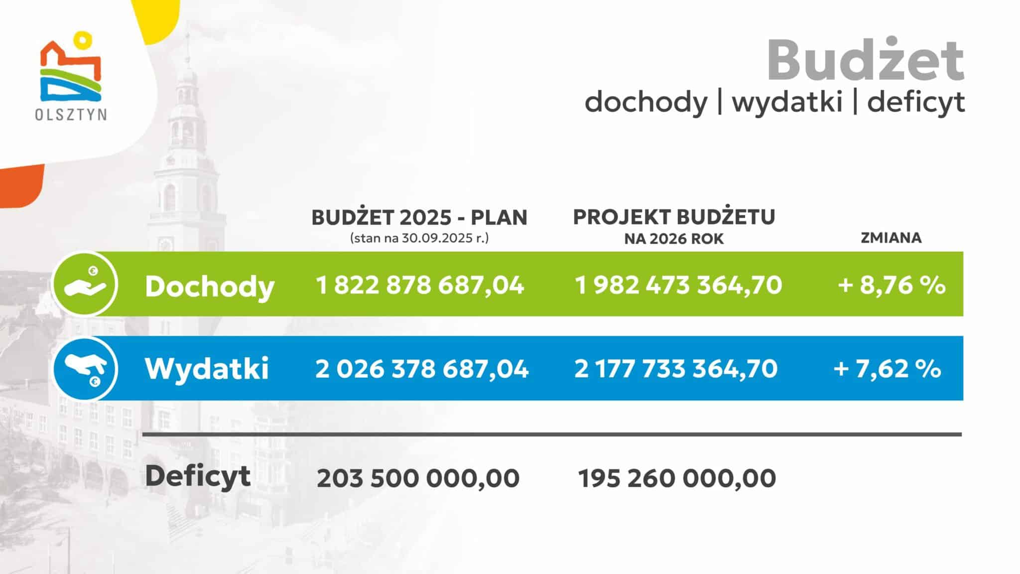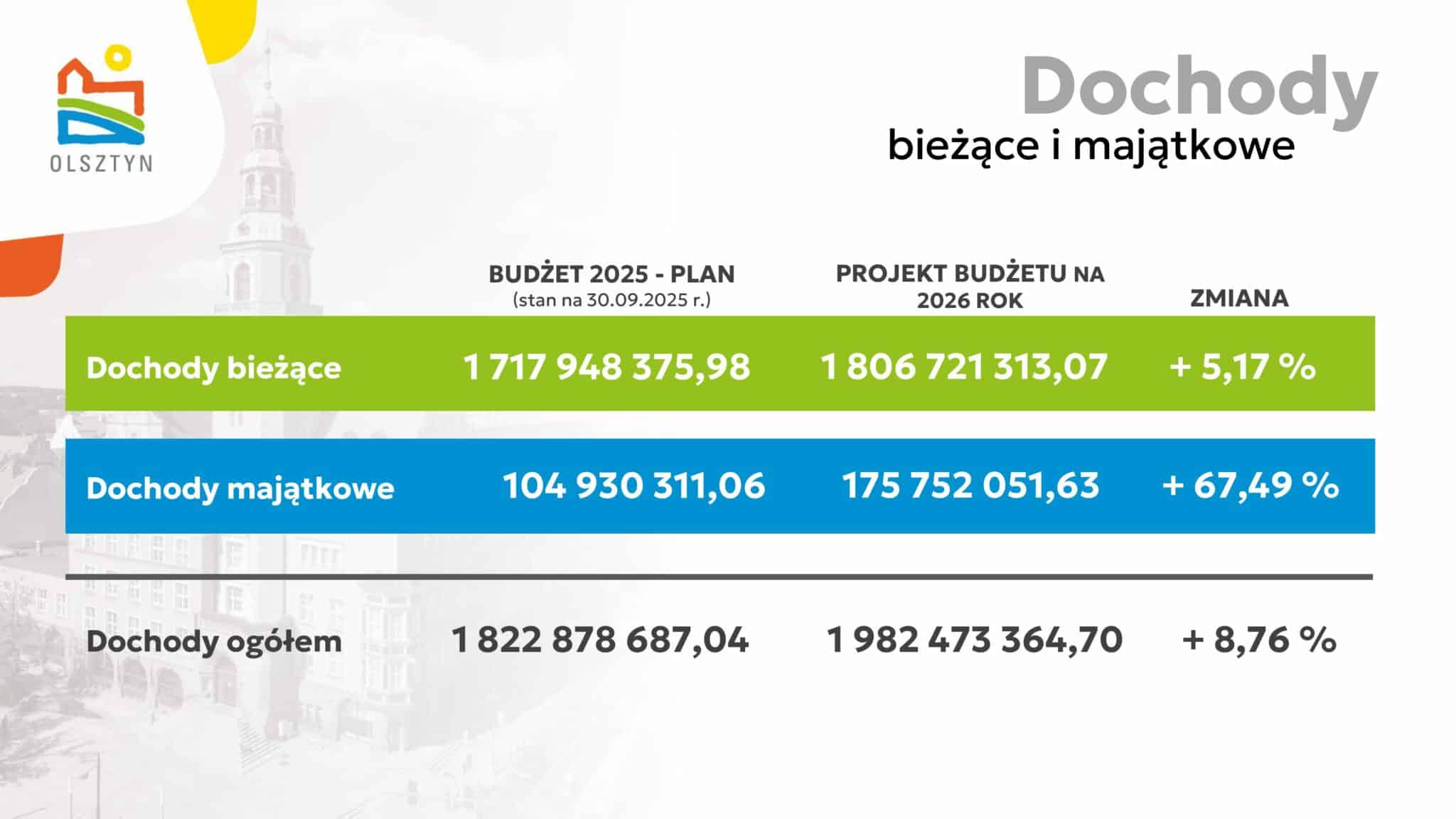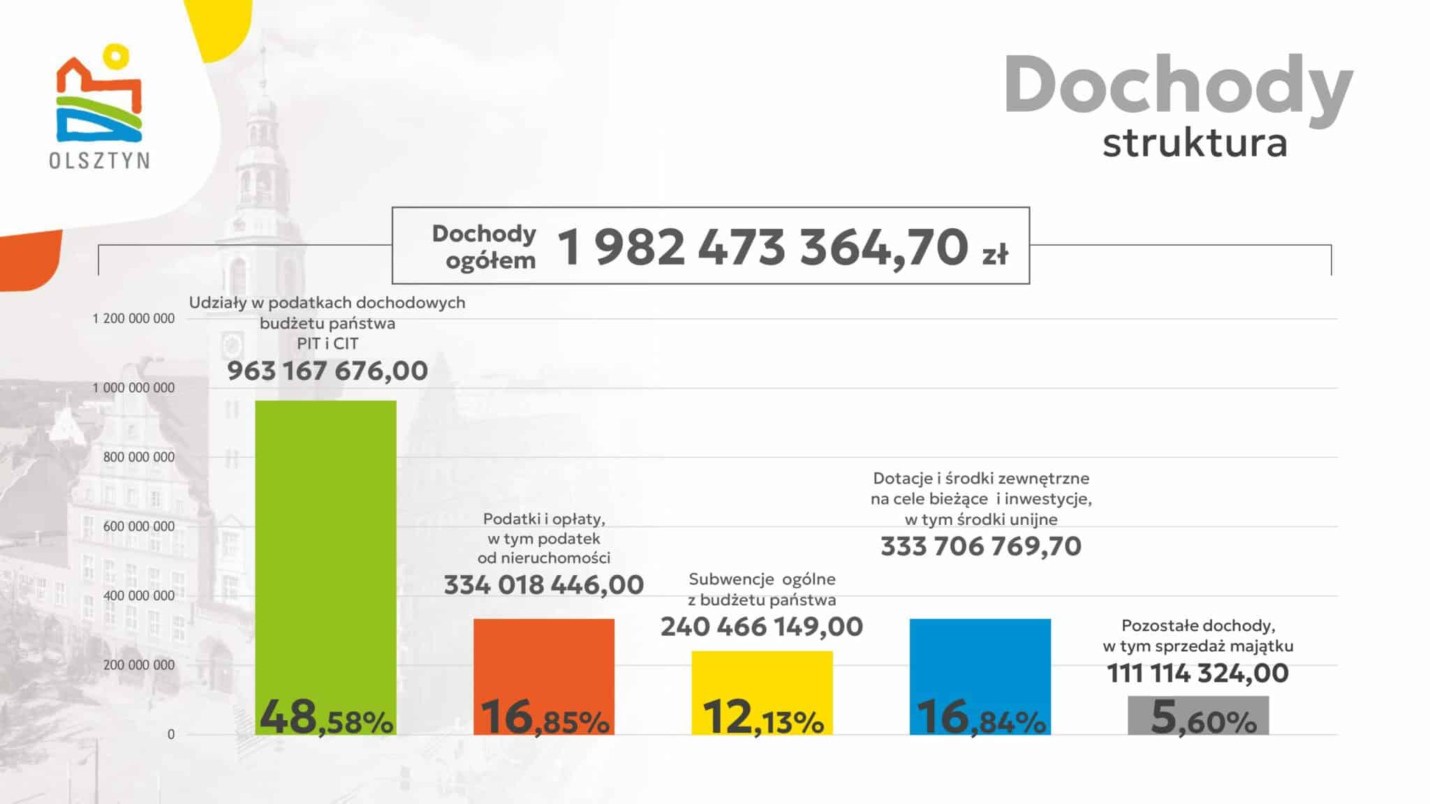 Zaplanowane dochody Olsztyna na 2026 rok wynoszą 1 miliard 982 miliony złotych. To środki pochodzące z różnych źródeł, jednak kluczową rolę odgrywają udziały miasta w podatkach PIT i CIT.