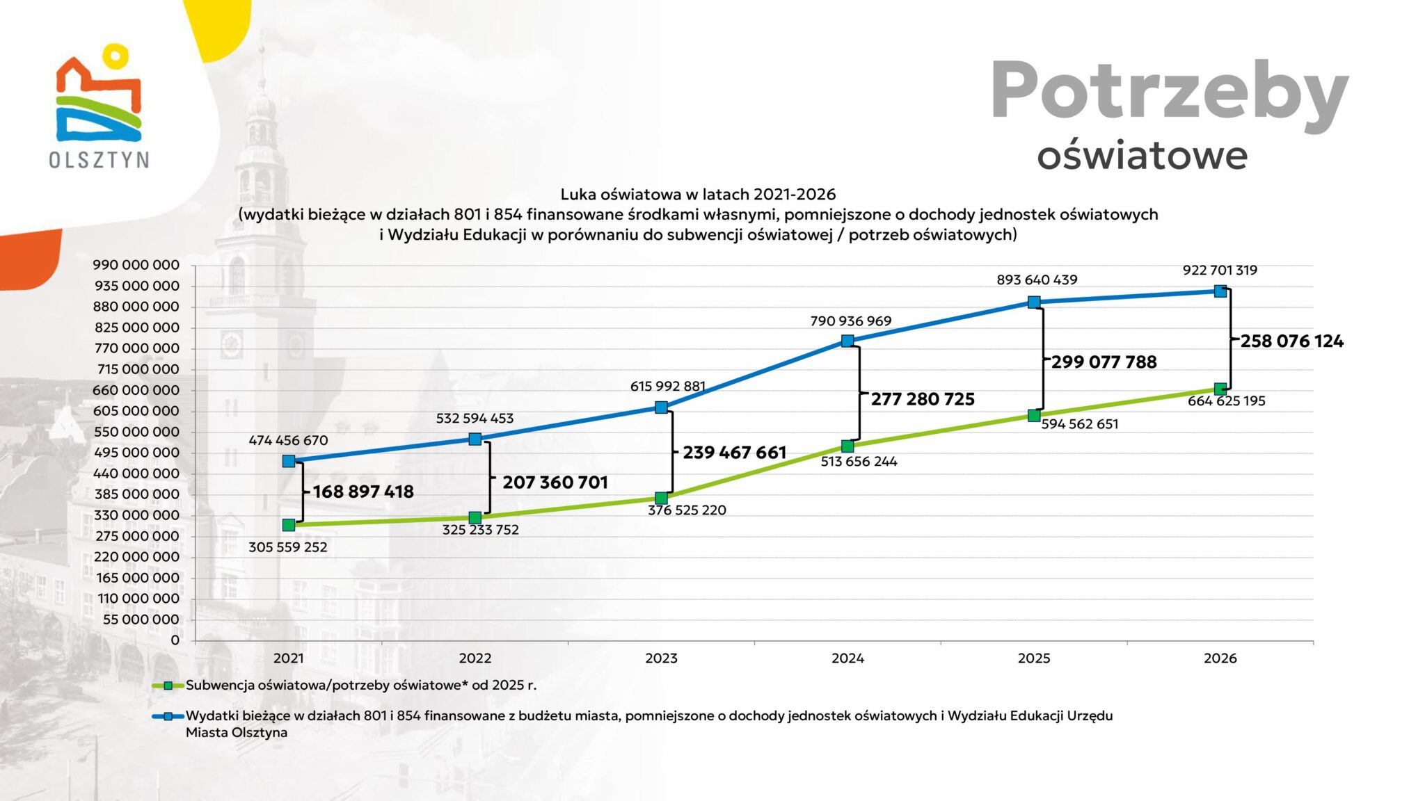 Władze miasta podkreślają, że jednym z wyzwań, z jakimi musi mierzyć się samorząd, jest wyraźny spadek liczby urodzeń. W 2019 roku w Olsztynie urodziło się 1511 dzieci, natomiast w 2024 roku było to już tylko 852. Mimo tego koszty utrzymania placówek oświatowych nie uległy zmniejszeniu.