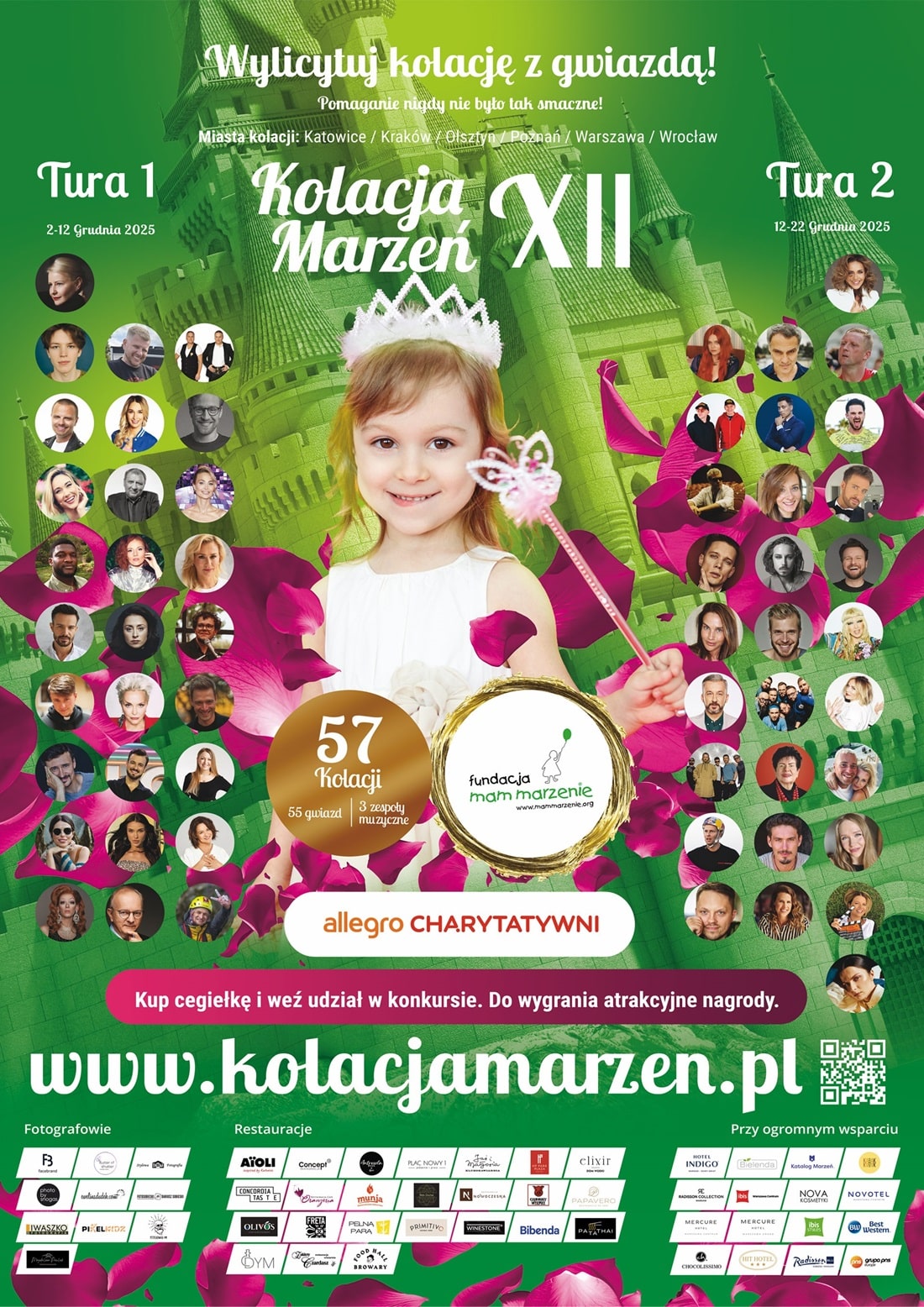 „Kolacja Marzeń” to już dwunasta edycja wyjątkowego projektu Fundacji Mam Marzenie, realizowanego we współpracy z Allegro. Tegoroczna odsłona to imponująca skala: 55 znanych osób, 3 zespoły muzyczne, 57 licytacji, 27 restauracji, 6 miast i 56 kolacji, które mają jeden wspólny cel – spełnianie marzeń dzieci.
