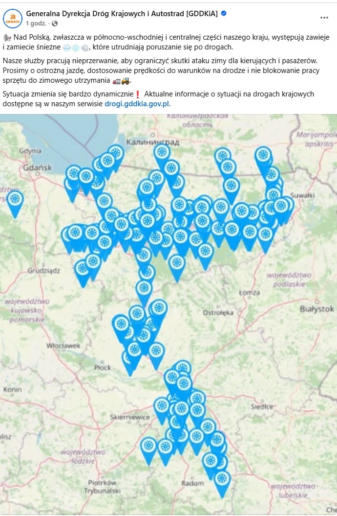 Służby podkreślają, że mimo pracy pługów i piaskarek warunki pogodowe utrudniają szybkie przywracanie przejezdności. Silny wiatr powoduje nawiewanie śniegu na wcześniej odśnieżone odcinki, a widoczność miejscami jest bardzo ograniczona.