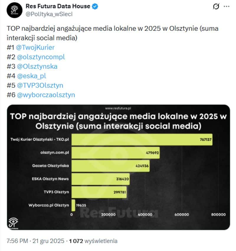 To ponad dwunastokrotna różnica w liczbie odbiorców, która przekłada się bezpośrednio na zasięg publikowanych treści, ich widoczność w regionie oraz realny wpływ informacyjny wśród mieszkańców Olsztyna i Warmii i Mazur.