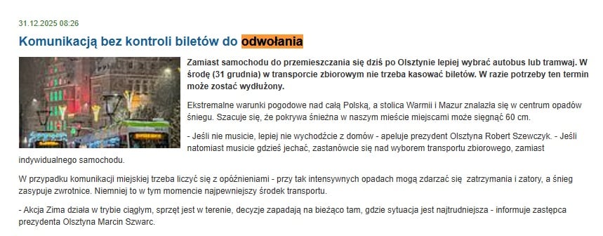 Wszystko zaczęło się w środowy poranek, 31 grudnia. W obliczu paraliżu miasta spowodowanego opadami śniegu, prezydent Olsztyna ogłosił darmową komunikację miejską. Oficjalny profil „Miasto Olsztyn” o godzinie 07:01 opublikował post, w którym czarno na białym stało: „dziś zostawcie auta w domu… bo do odwołania nie będziemy kontrolować biletów”. Informacja błyskawicznie obiegła media, a mieszkańcy odetchnęli z ulgą.