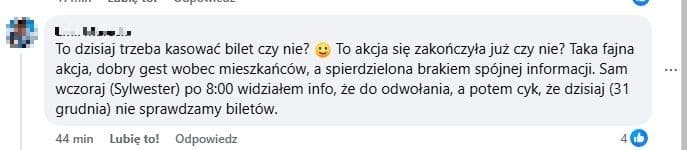 Jeszcze po godzinie 15:00, w odpowiedziach na pytania mieszkańców pod swoimi postami, urzednicy sugerowali, że darmowa komunikacja nadal obowiązuje. W tym samym czasie rzecznik Ratusza dopiero o 16:26 wysyłał do mediów e-mail z „nową wersją” rzeczywistości: że darmowe przejazdy są przedłużone, ale tylko do końca dnia (1 stycznia), a od jutra koniec taryfy ulgowej (2 stycznia).