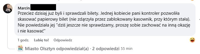 • 15:00 – 16:00 – Aktywność urzedników w komentarzach: Prezydent Olsztyna, odpowiadając bezpośrednio pod postami, sugeruje, że darmowa komunikacja wciąż obowiązuje. To pogłębia chaos, bo w tym samym czasie kontrolerzy w autobusach nakazują pasażerom kasowanie biletów., przec o stracili pieniądze na przejazd.