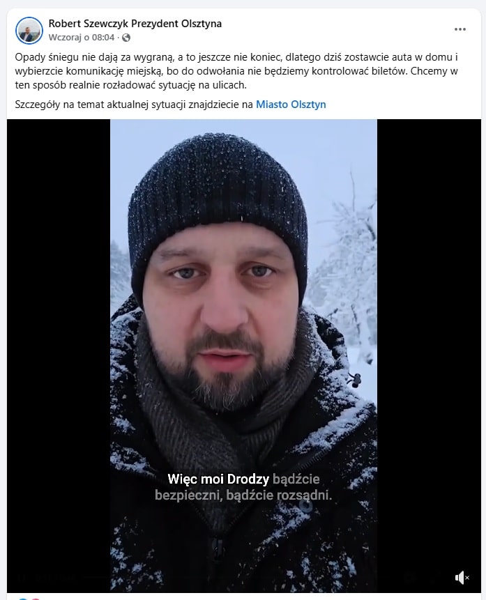 • 07:01 – Oficjalny profil „Miasto Olsztyn”: Publikacja posta o darmowej komunikacji miejskiej ze względu na ekstremalne opady śniegu. W treści pada kluczowe sformułowanie: kontrole są zawieszone „do odwołania”.